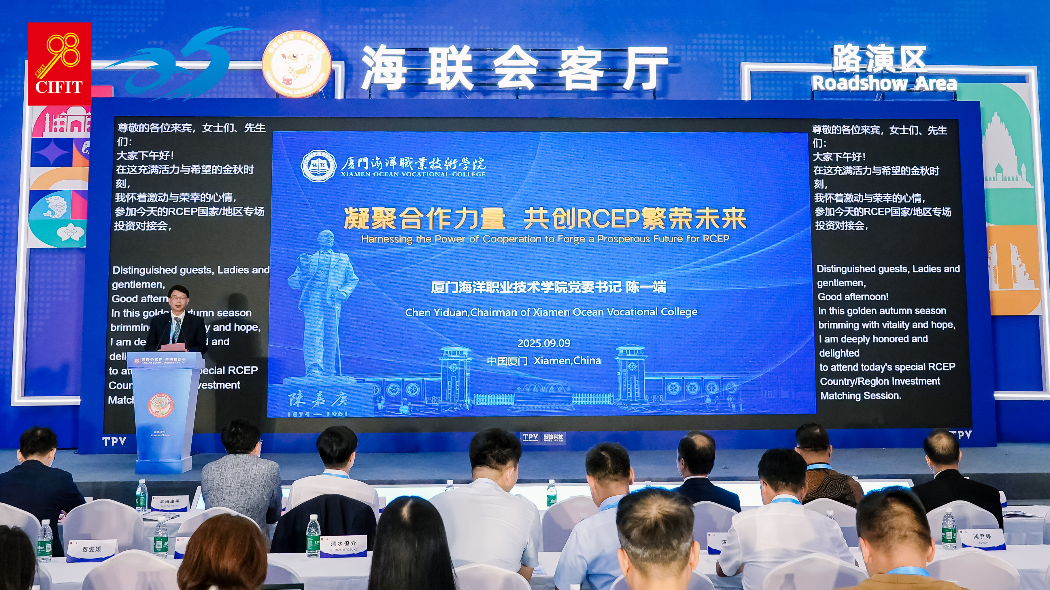9 月 9 日下午,第二十五届中国国际投资贸易洽谈会(简称“投洽会”)系列活动之“海联会客厅·走进投洽会——RCEP国家/地区投资对接会”在厦门国际会展中心举办。我校作为此次活动的主要承办方,全程参与活动的策划与执行工作。