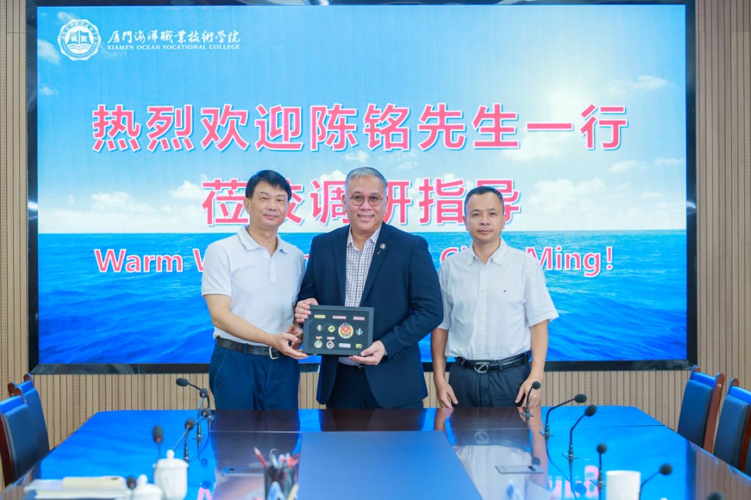 陈铭先生回忆2023年随其父、陈嘉庚长孙陈立人先生到校参访的情景,表示目睹如火如荼的校园扩建工程,对学校未来发展充满期待;他表示将一如既往并发动家族力量支持嘉庚老先生创办的海洋职业教育事业。座谈中,双方还就推动学校与印度尼西亚政府开展项目合作事宜进行探讨。