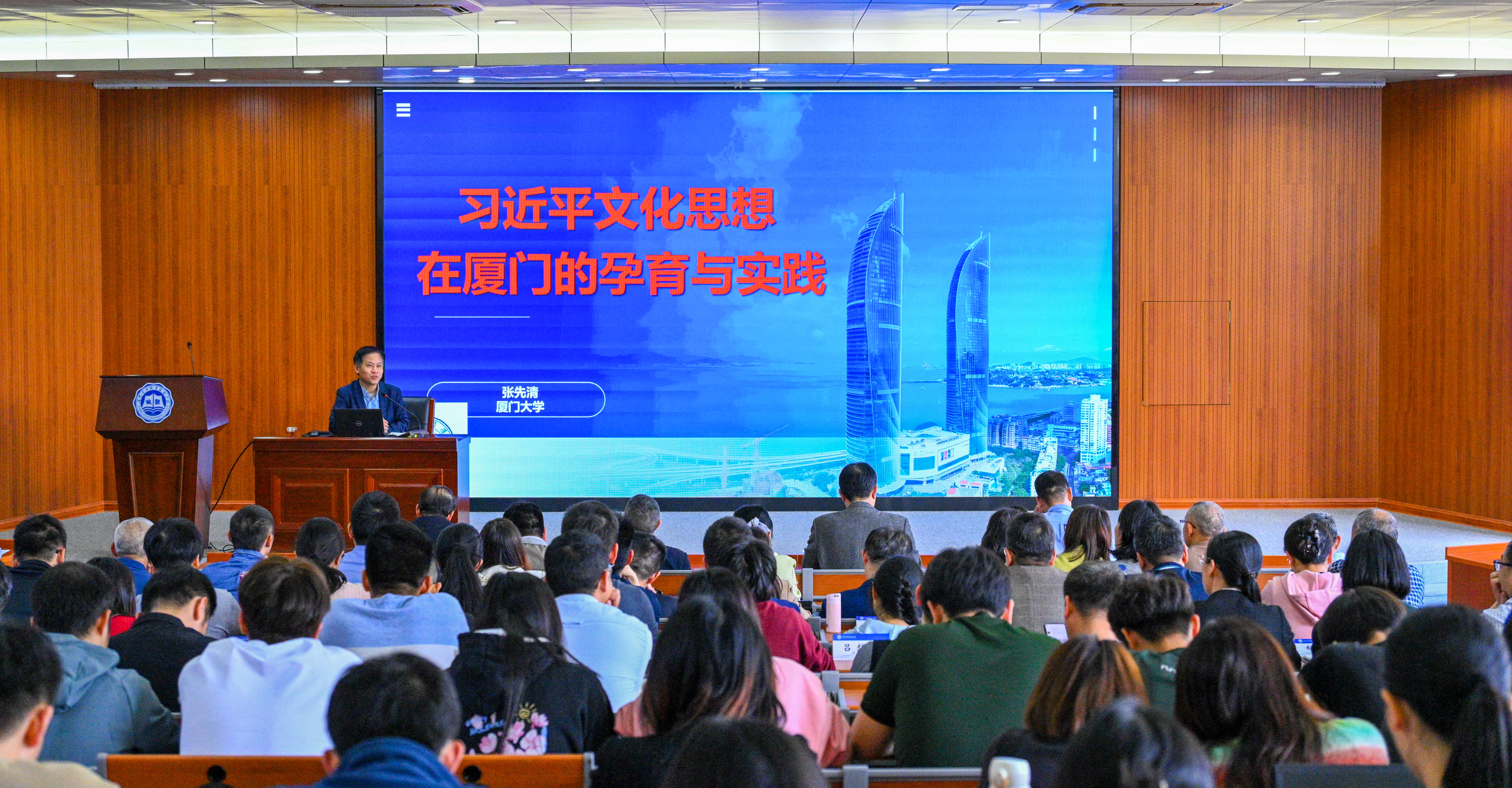 张先清教授的报告从习近平文化思想的重大意义和丰富内涵、习近平文化思想在厦门的孕育与实践、以习近平文化思想为指引建设新时代文化强市等三个方面展开。他指出,习近平文化思想蕴含一系列重大创新观点和重大战略部署,是推动社会主义文化繁荣兴盛的根本遵循,既具有强烈的立足中国的现实意义,又具有深沉的关乎长远的战略内涵。他认为,习近平总书记对厦门城市文化特性有深度的认知,突出表现在整体战略布局、保护文化遗产、传承历史文脉、提炼城市精神、促进文明互鉴等方面,为习近平文化思想的提出奠定了坚实基础。张先清教授还从坚定文化自信、保护文化遗产、推动文化创新等方面,深入探讨了以习近平文化思想为指引建设新时代文化强市的路径和方法。张先清教授的报告理论扎实、内容丰富、讲述生动,受到了干部师生的热烈欢迎和高度好评。