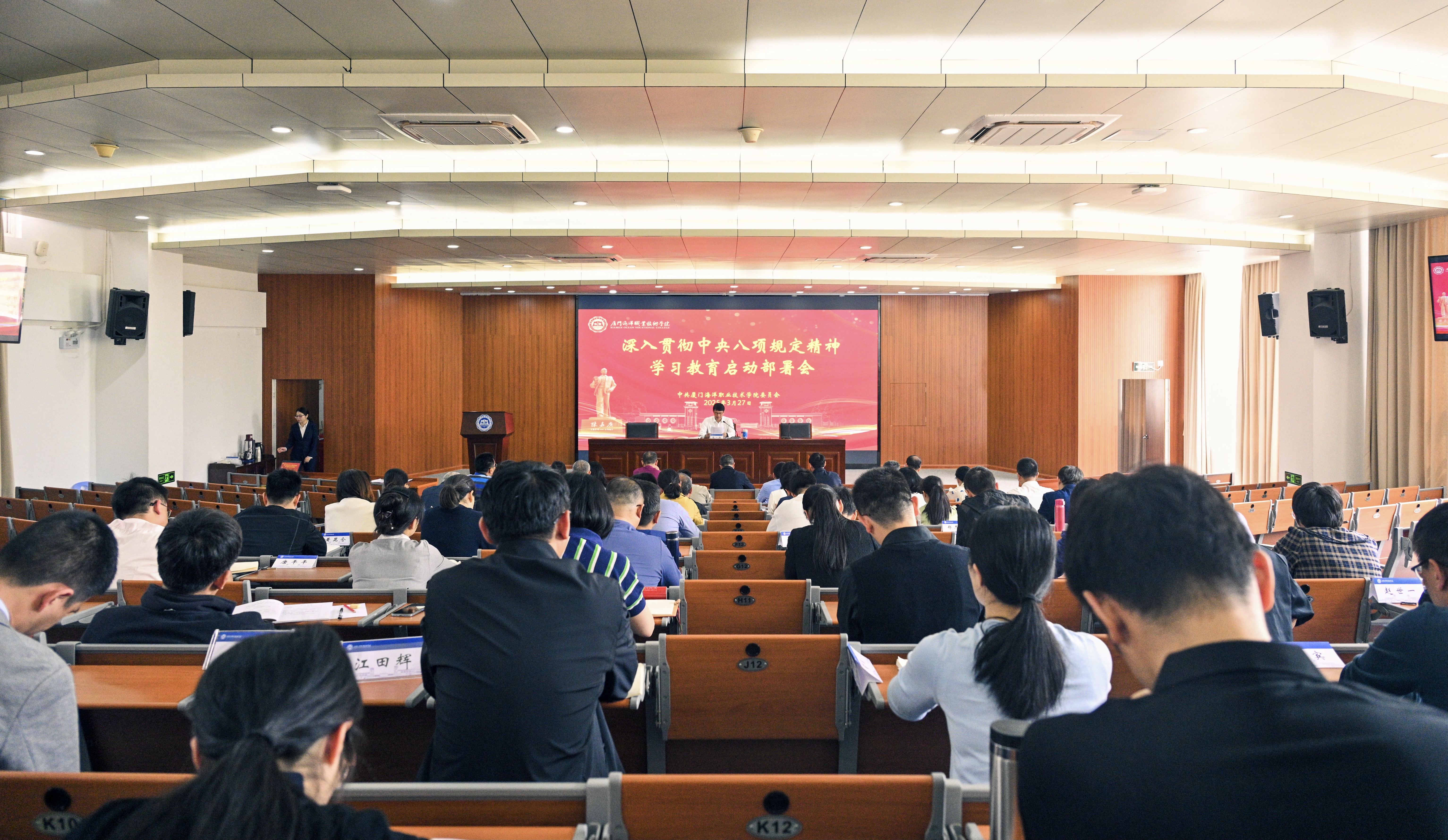 3月27日,厦门海洋职业技术学院党委召开深入贯彻中央八项规定精神学习教育启动部署会,党委书记陈一端主持会议并作动员部署讲话,在家校领导、中层干部等参加会议。