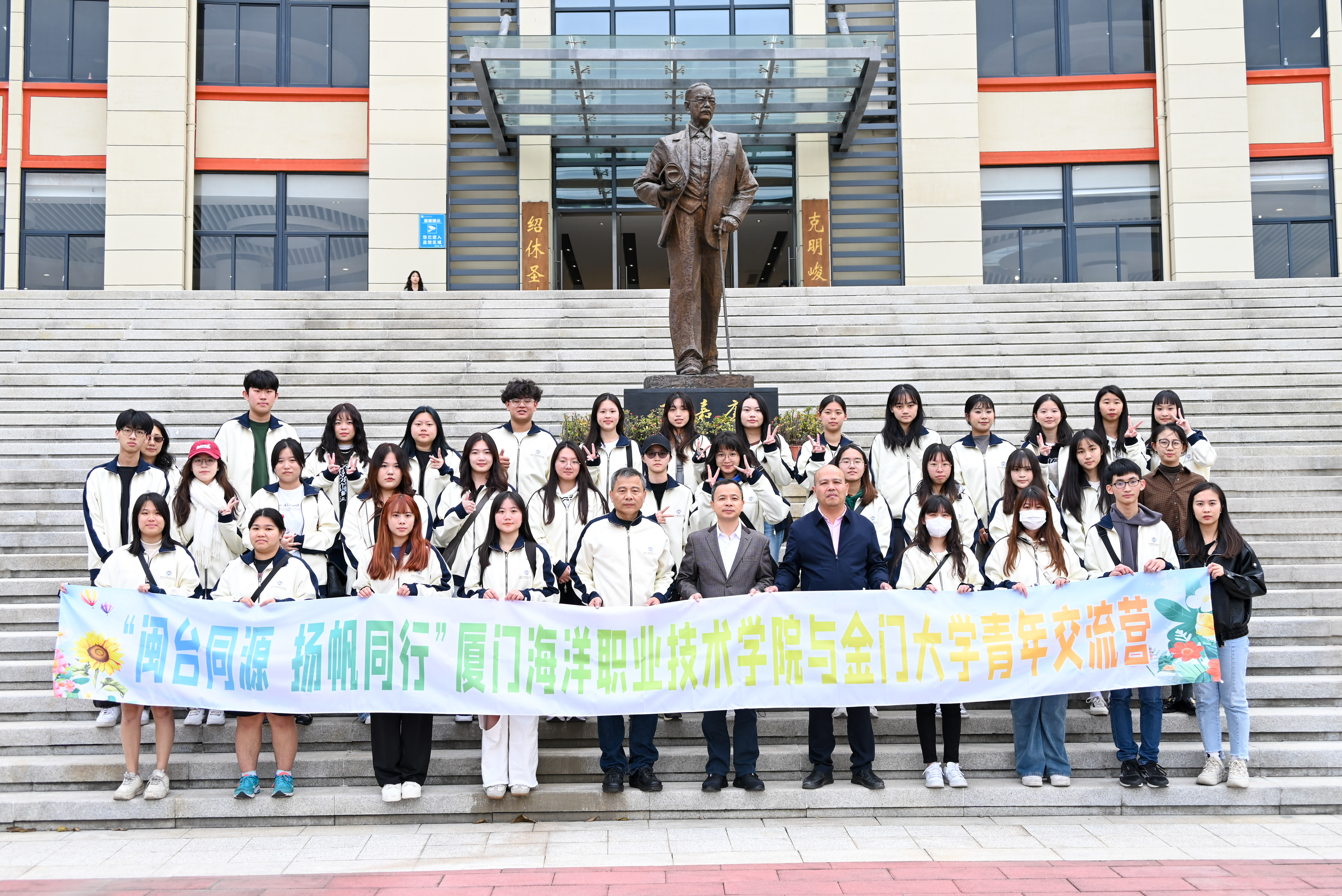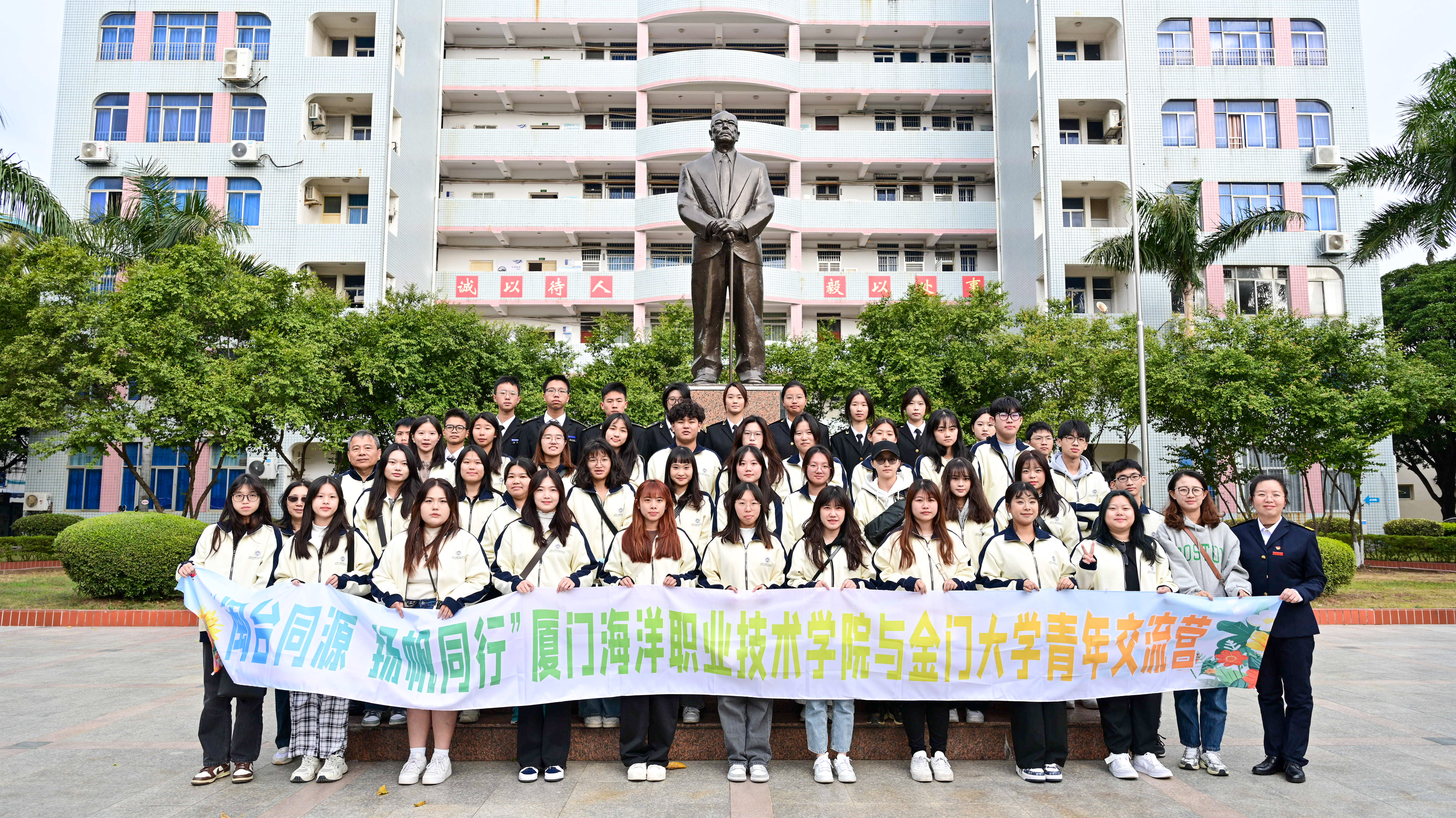 交流营师生在翔安校区嘉庚铜像前合影