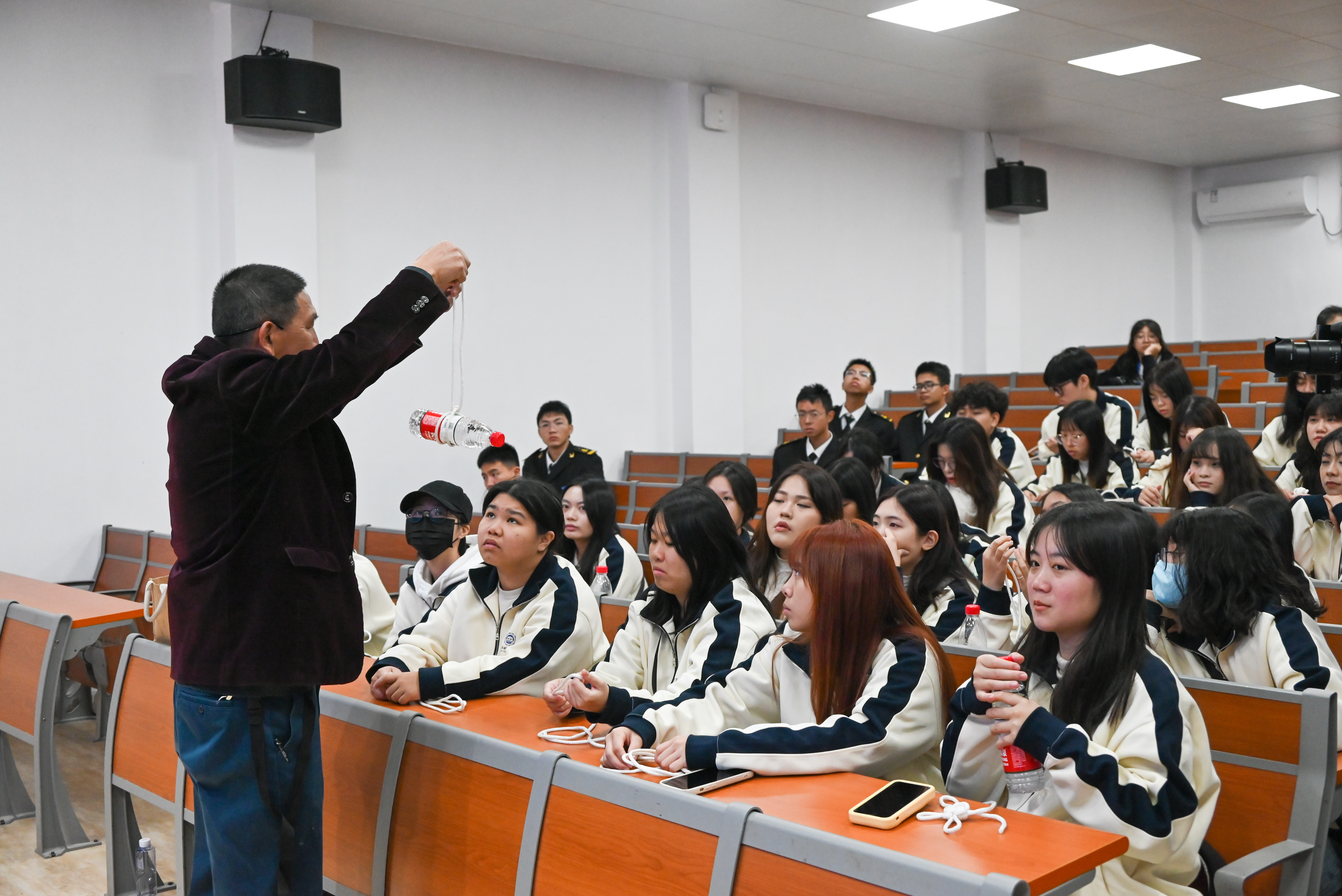 在接下来两天的活动中,金门大学师生一行参观操作了我校大型船舶操纵模拟器及全任务轮机模拟器,沉浸式体验航海船舶驾驶;参观了凌云玉石博物馆,感受中国传统玉雕与现代艺术相结合的魅力;亲身体验了我校海洋特色文化育人项目——帆船课程,感受扬帆出海、乘风破浪的激情;参与了“海丝结”制作,通过制作单套结、水手结、瓶口结等10种专业绳结,体会感悟深厚的中华海洋文化。