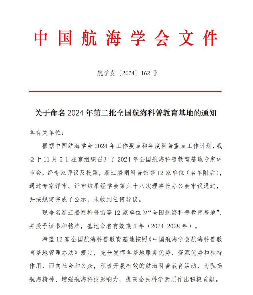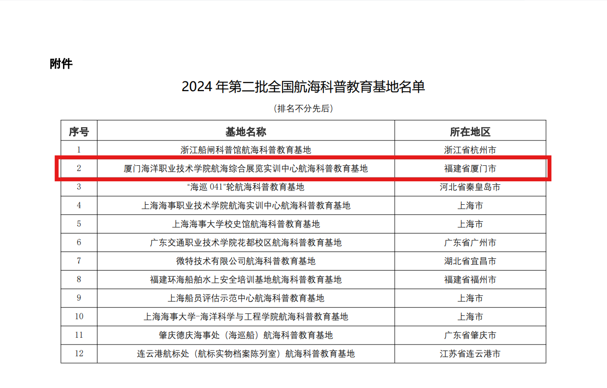 近日,中国航海学会公布2024年第二批全国航海科普教育基地评审结果,厦门海洋职业技术学院航海综合展览实训中心航海科普基地成功入选,成为福建省唯一入选本批次的基地。这是继我校海洋文化科普综合教育基地项目成功入选2024年高校思想政治工作质量提升综合改革与精品建设项目全国高校综合性教育实践体验基地建设名单以来,获得的又一全国性基地荣誉称号。