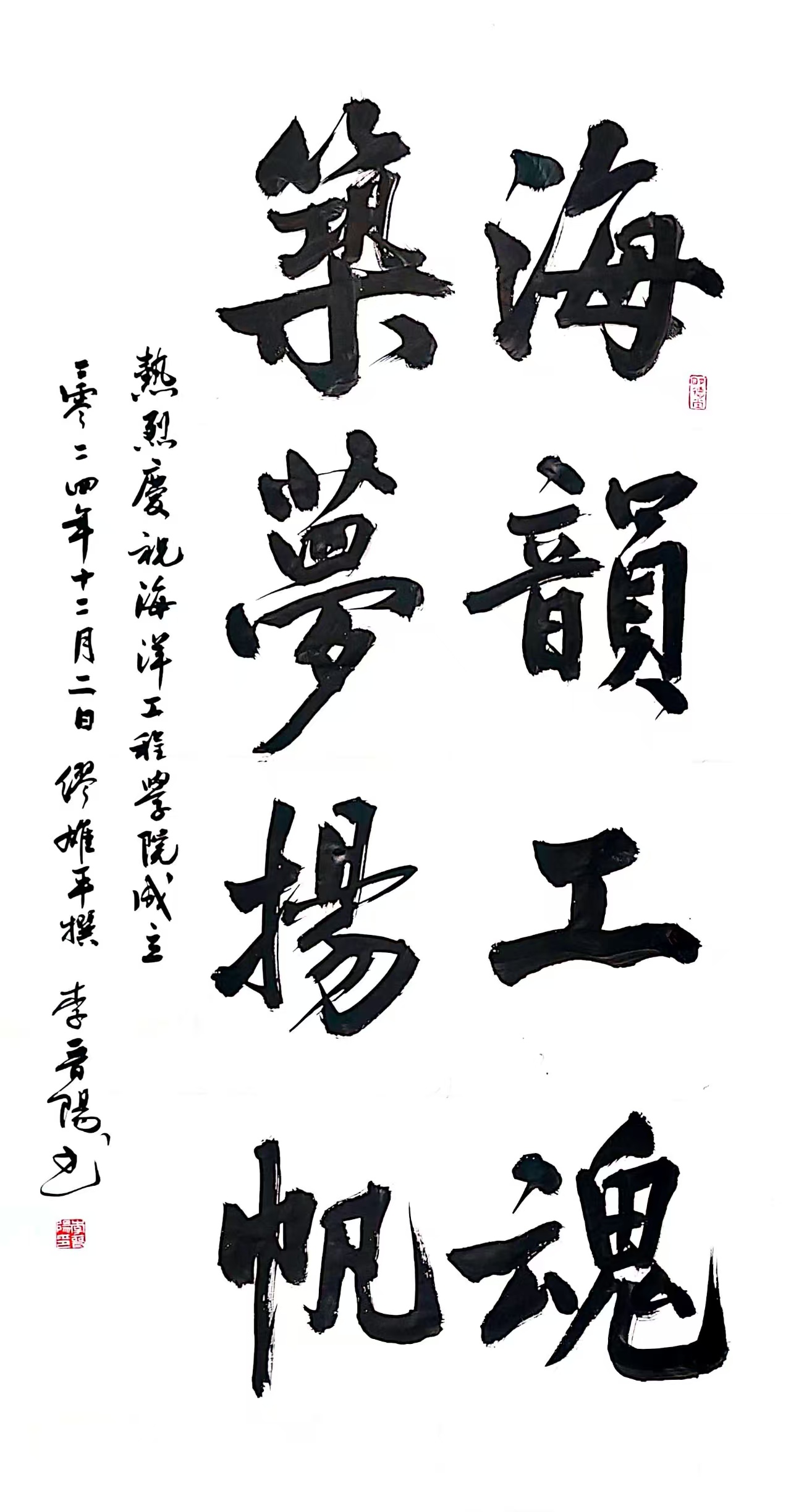 缪雄平撰文,书法家李晋阳校友为海洋工程学院的成立留下墨宝“海韵工魂 筑梦扬帆”,以示祝贺。