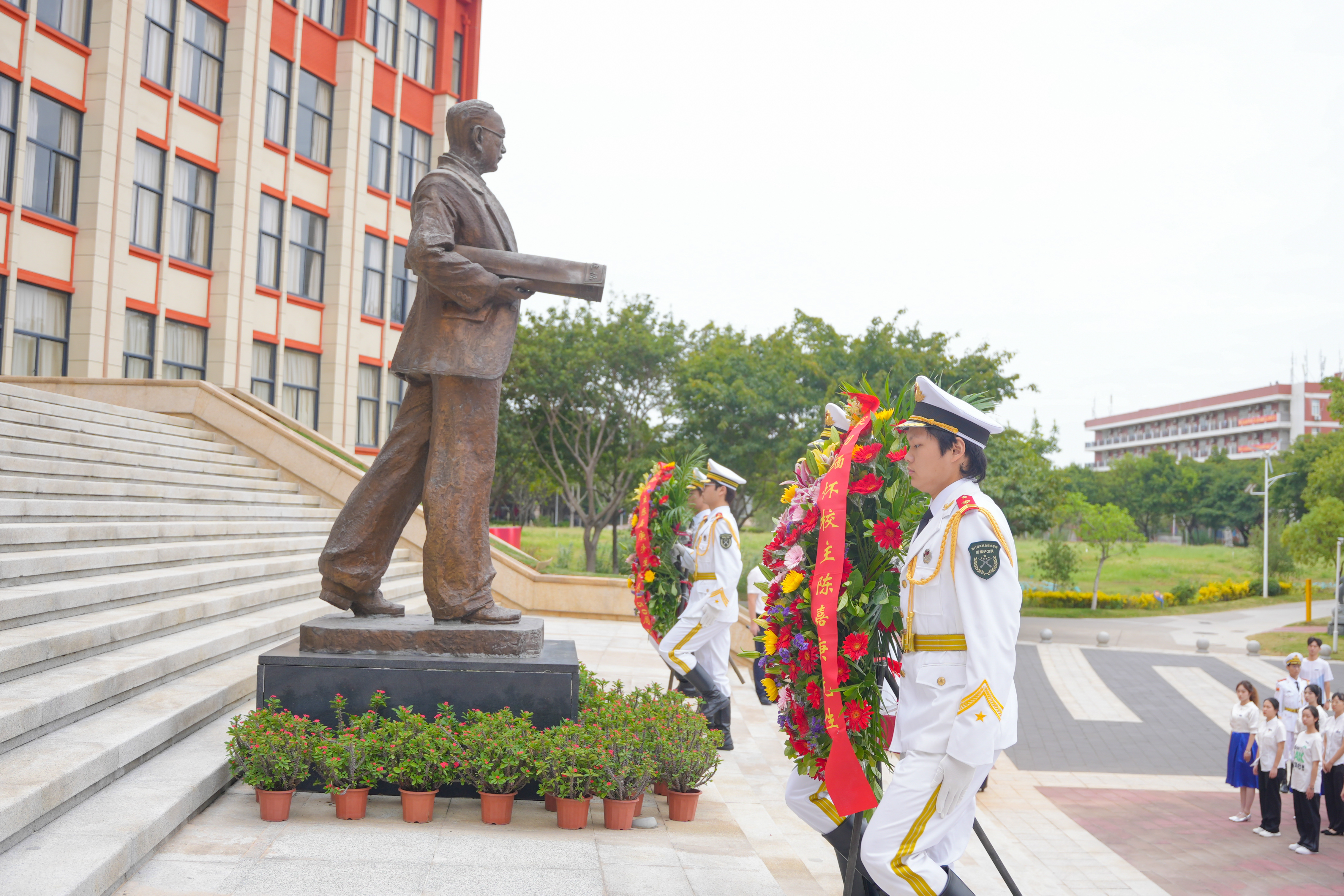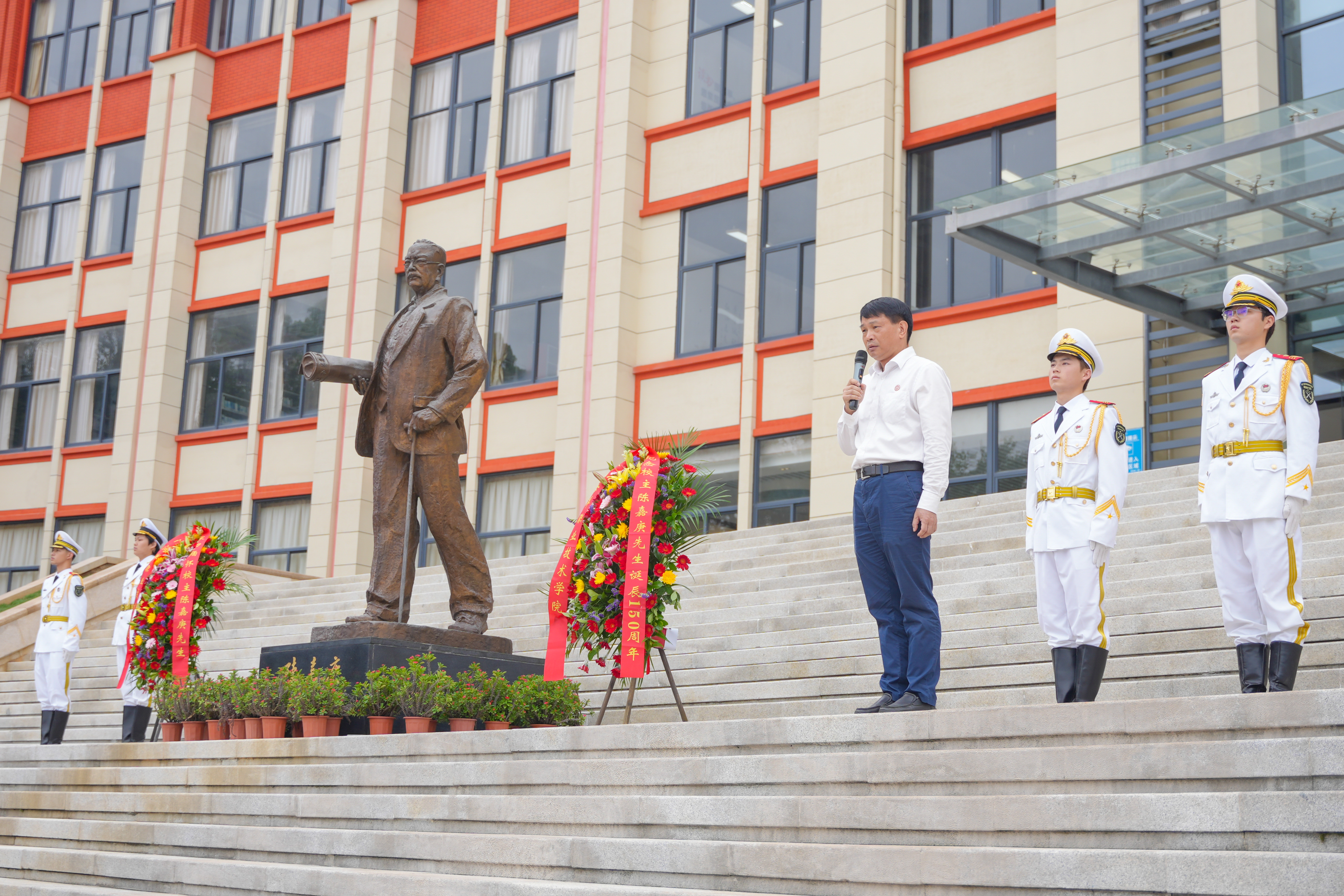 仪式在庄严肃穆的氛围中开始,伴随着深情的《献花曲》,国旗护卫队的同学迈着坚定有力的正步,护送花篮走到陈嘉庚先生铜像前,将花篮轻轻放下。花篮红色缎带上“深切缅怀校主陈嘉庚先生”“纪念校主陈嘉庚先生诞辰150周年”的金色大字熠熠生辉,寄托着对校主的深切怀念和崇高敬意。
