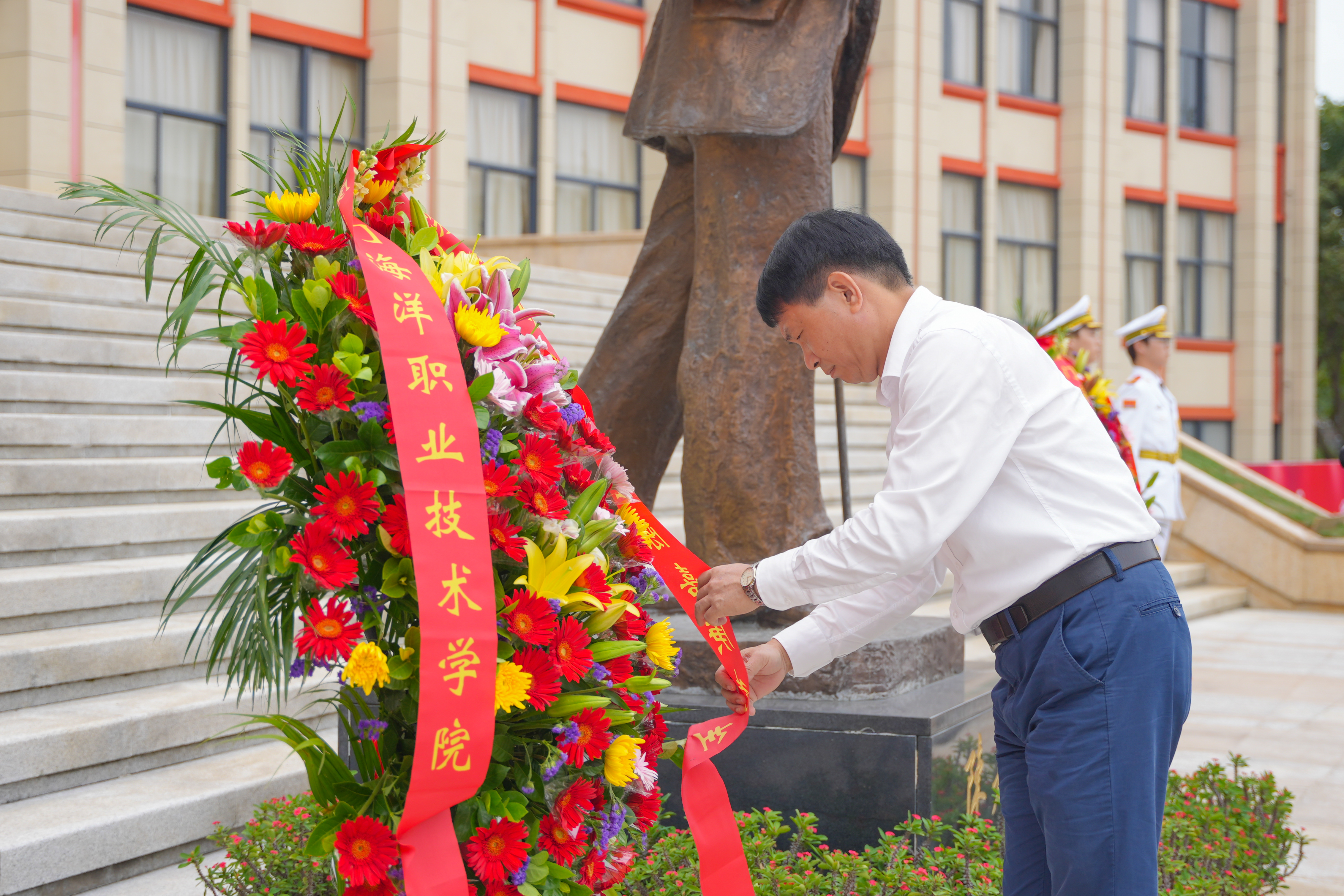 陈一端缓步上前,仔细整理花篮上的红色缎带。他在致辞中表示,全校师生要秉承“嘉庚精神”、践行“诚毅”校训,始终牢记校主“开拓海洋,挽回海权、培育专才”的建校宗旨,继承和开拓嘉庚先生海洋职业教育事业,主动融入新时代海洋强国强省建设,凝心聚力、锐意进取,兴学育才、谋海强国,加快建设高水平职业教育类型海洋大学,为建设海洋强国作出更大贡献,使“嘉庚精神”跨越时空、永放光芒。
