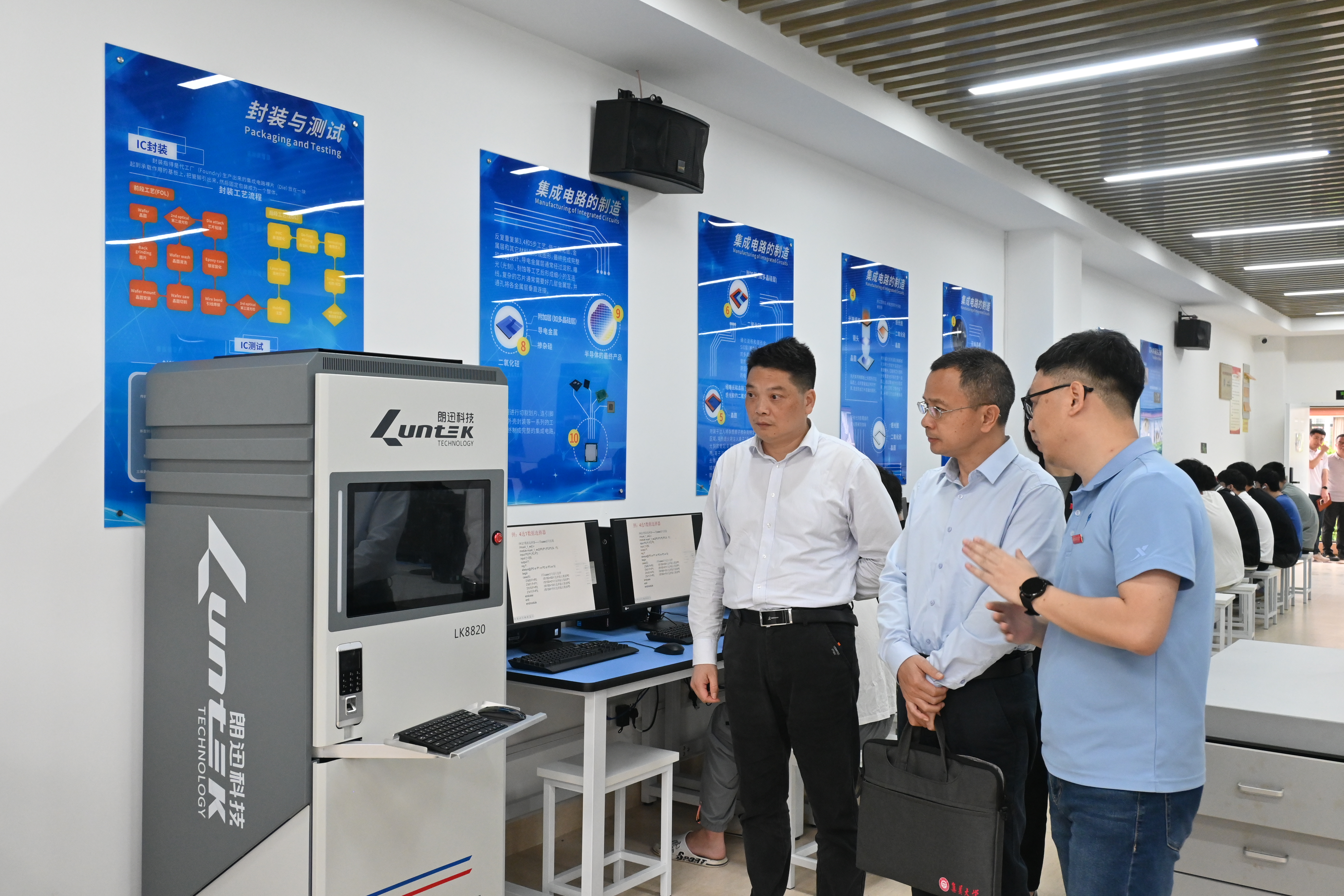 在信息工程学院,刘光明来到集成电路虚拟仿真实验室、光伏电站运维实训室、赵玉超技能大师工作室和电子协会活动室,同师生亲切交流。他指出,数字化、智能化是产业转型升级的主要方向,信息工程学院应当遵循教育规律,结合学校中心工作,积极助推学校人才培养、专业建设的数字化转型升级;要结合学院专业特色和地方、企业发展需求,勇于打破学院、教研室的界限,推动更多优质的产科教平台落地;要结合教师研究志趣和优势方向做好团队建设,强化激励和支持机制,积极发挥传帮带作用,营造更加浓厚的学术氛围。