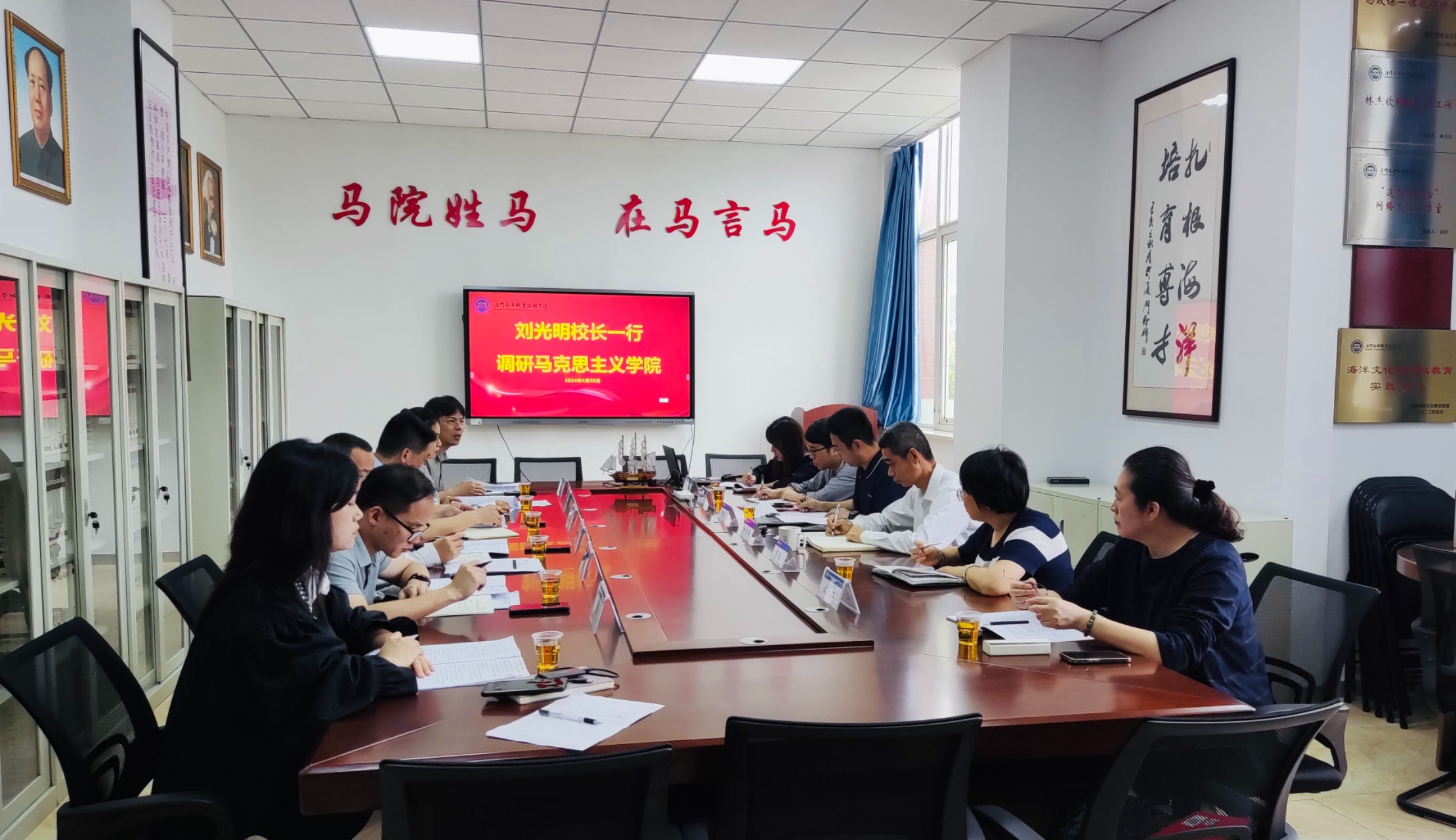 在海洋文化与旅游学院,刘光明深入了解了学院在人才培养、基地建设、社会服务以及发挥专业优势服务闽台融合方面取得的成效。他说,学校发展离不开全体教职工的共同努力,如何充分激发教师的活力和潜力是学校及每个二级学院的“必答题”。他指出,海洋文化与旅游学院作为学校的新兴学院,要以职教本科创建为契机,加强内部研讨和外部调研,推进专业调整升级,不断增强学院发展的驱动力、创新力、竞争力;要强化内涵建设,充分利用现有人才、平台、项目资源有意识地进行项目储备,力争形成更多高水平、特色化成果;要重点强化师资队伍建设,积极主动作为,加大人才引进力度,进一步营造有利于凝聚人心、潜心学术的优良氛围。