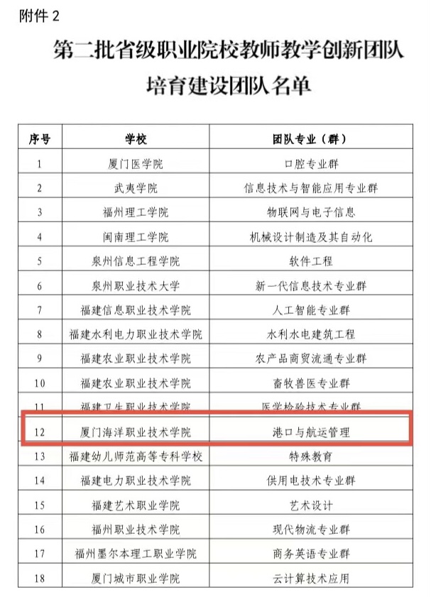 近日,福建省教育厅公布了第二批省级职业院校教师教学创新团队培育建设团队名单,我校航海学院港口与航运管理专业教学团队入选省级职业院校教师教学创新团队培育建设团队。