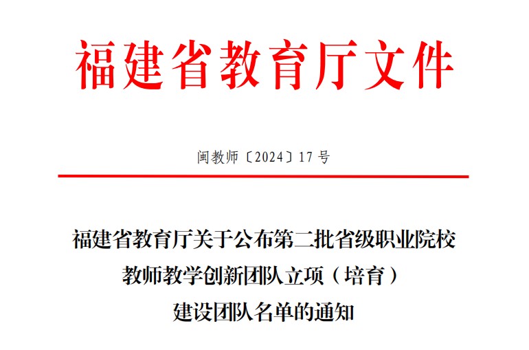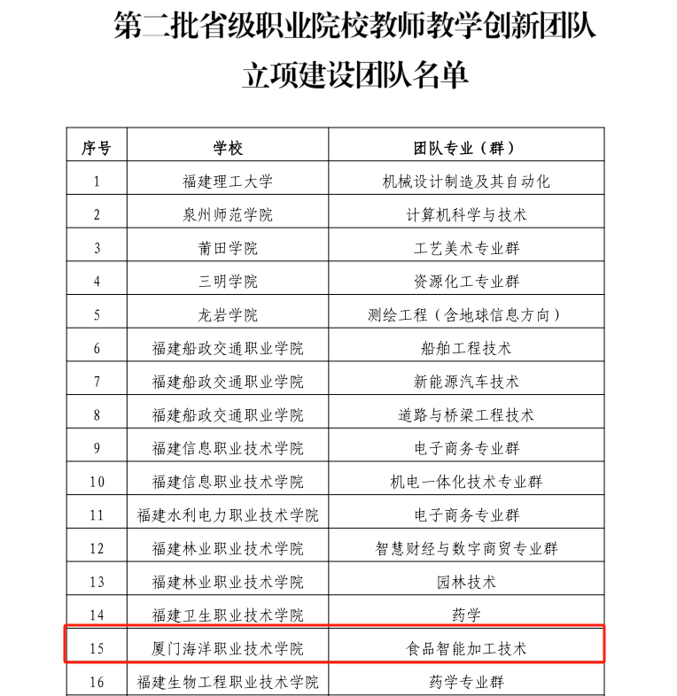 近日,福建省教育厅公布第二批省级职业院校教师教学创新团队立项建设团队名单,我校食品智能加工技术专业教学团队成功入选。