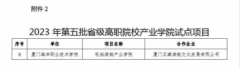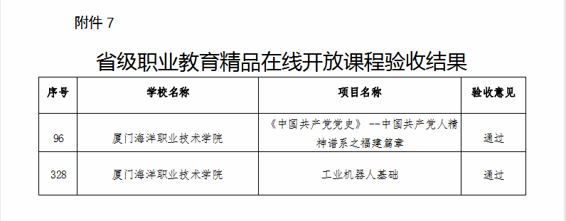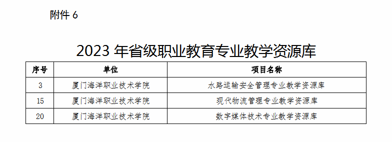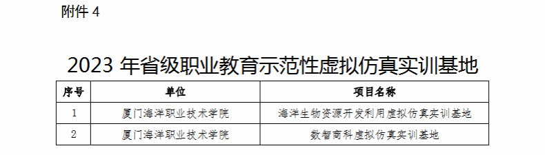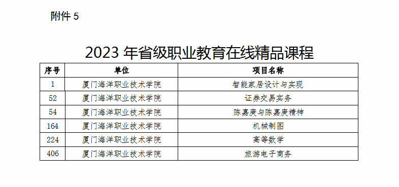其中,《智能家居设计与实现》《证券交易实务》《陈嘉庚与陈嘉庚精神》《机械制图》《高等数学》《旅游电子商务》等6门课程入选省级职业教育在线精品课程;水路运输安全管理、现代物流管理、数字媒体技术等3个专业教学资源库入选省级职业教育专业教学资源库,为我校历年最好成绩;帆船游艇产业学院入选第五批省级高职院校产业学院试点项目;智慧渔业产教融合实训基地与海洋生物应用技术产教融合实训基地入选省级高水平专业化产教融合实训基地;海洋生物资源开发利用虚拟仿真实训基地与数智商科虚拟仿真实训基地入选省级职业教育示范性虚拟仿真实训基地。另有2门课程通过省级职业教育精品在线开放课程验收。