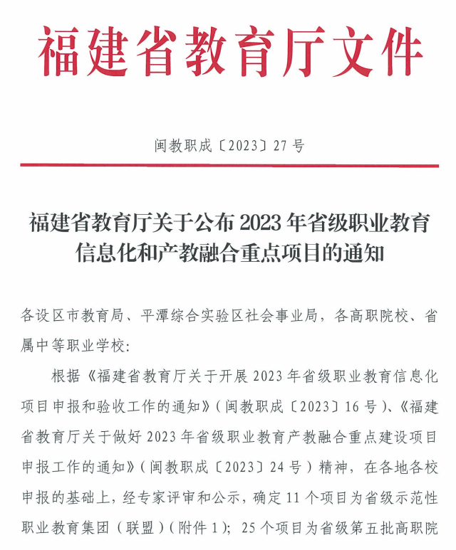 近日,《福建省教育厅关于公布2023年省级职业教育信息化和产教融合重点项目的通知》文件正式公布,我校共有14个项目成功入选2023年省级职业教育信息化和产教融合重点项目。