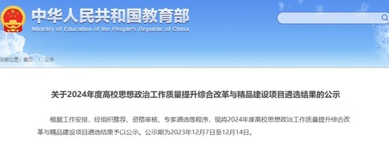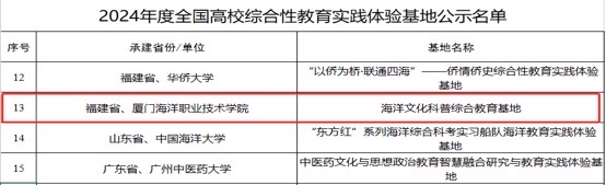 近日,教育部公示了《2024年度高校思想政治工作质量提升综合改革与精品建设项目遴选结果》,我校海洋文化科普综合教育基地项目成功入选全国高校综合性教育实践体验基地项目建设名单,成为福建省高职院校唯一入选的高校思政项目。