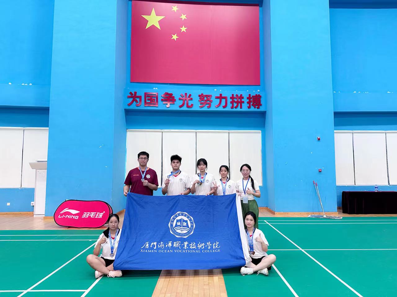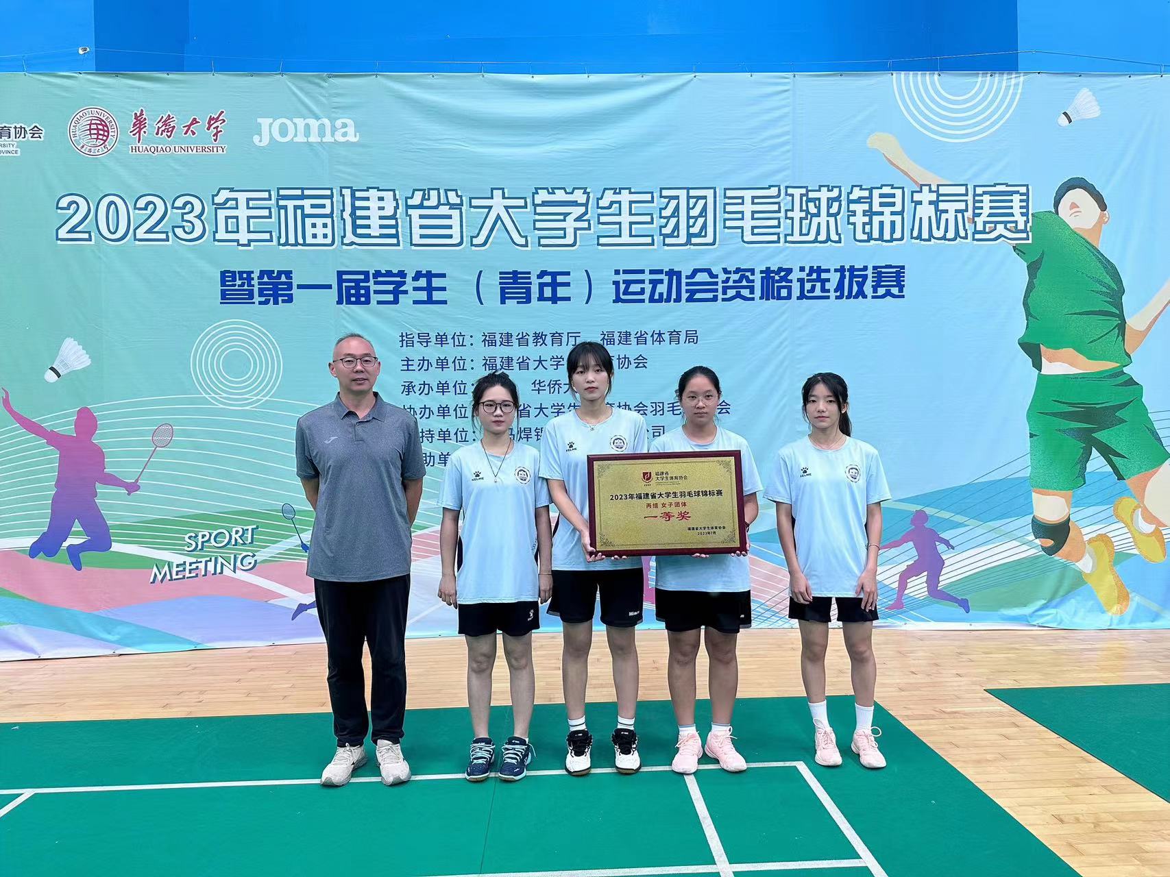 2023年福建省大学生羽毛球锦标赛于7月8日-14日在泉州举行。本次比赛高职组共设7枚金牌,我校羽毛球队在领队葛冯敏、教练陈玥莹、邹灵果老师的带领下,经过激烈角逐、奋勇拼搏,斩获女子团体、女子双打、混合双打3枚金牌。