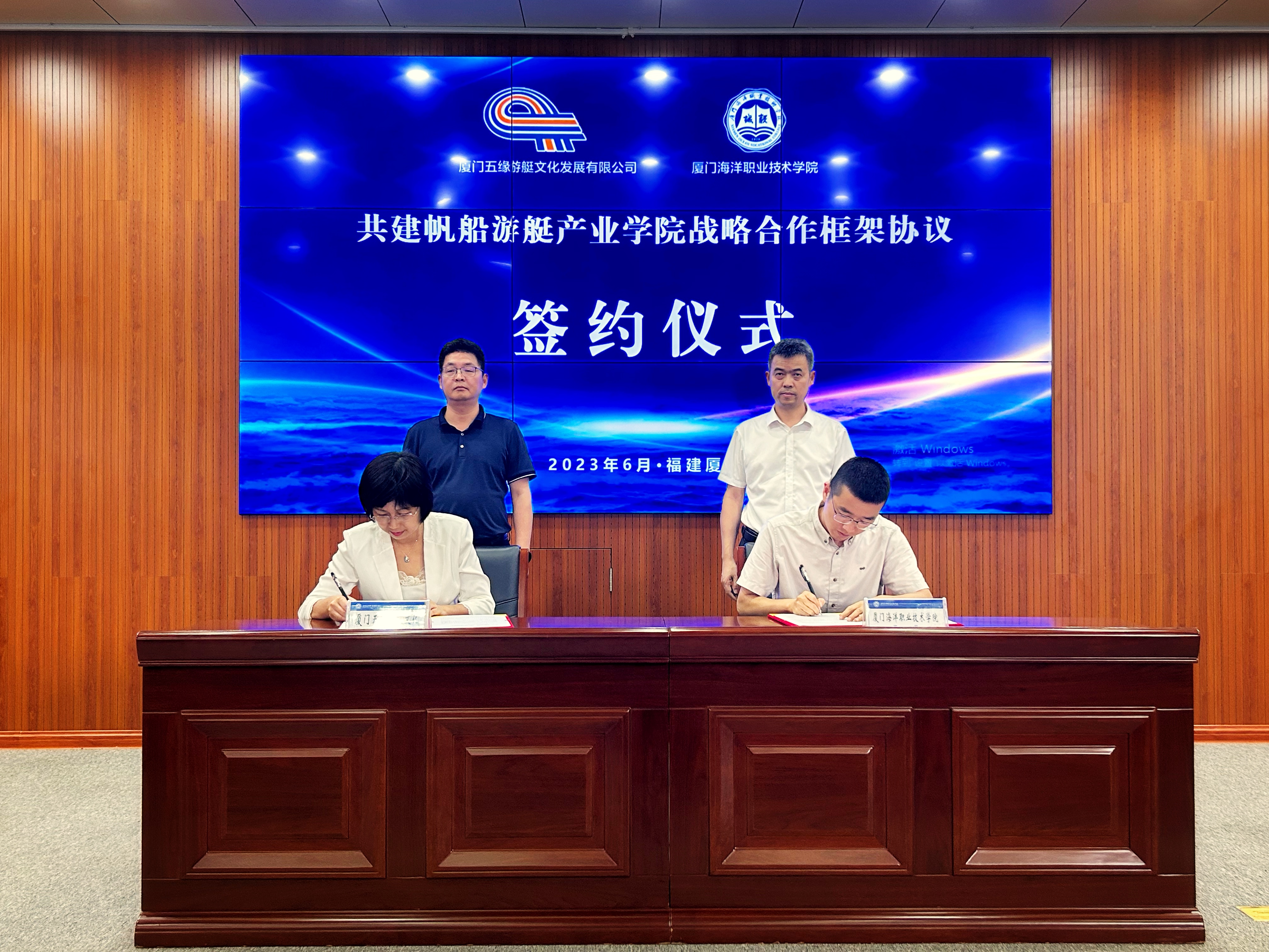 6月12日,我校与厦门五缘游艇文化发展有限公司共建帆船游艇产业学院揭牌暨“望潮”定向班开班仪式在翔安校区举行。厦门路桥城市服务发展有限公司执行董事、总经理林瑞滨,厦门五缘游艇文化发展有限公司总经理林芳芳,副总经理许毅虹,院长陈昌萍,党委副书记缪雄平,教务处处长倪辉等出席仪式。仪式由缪雄平主持。