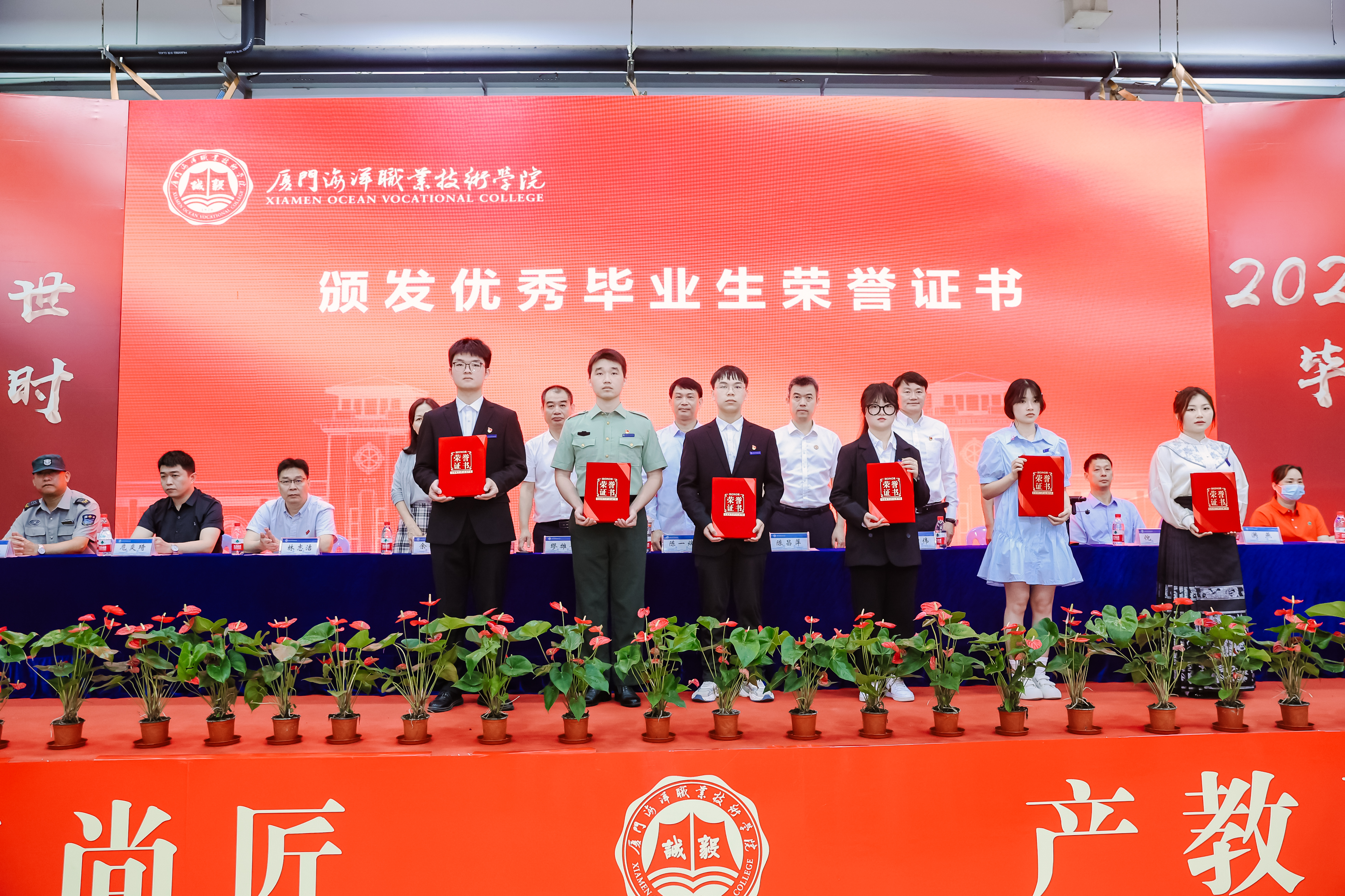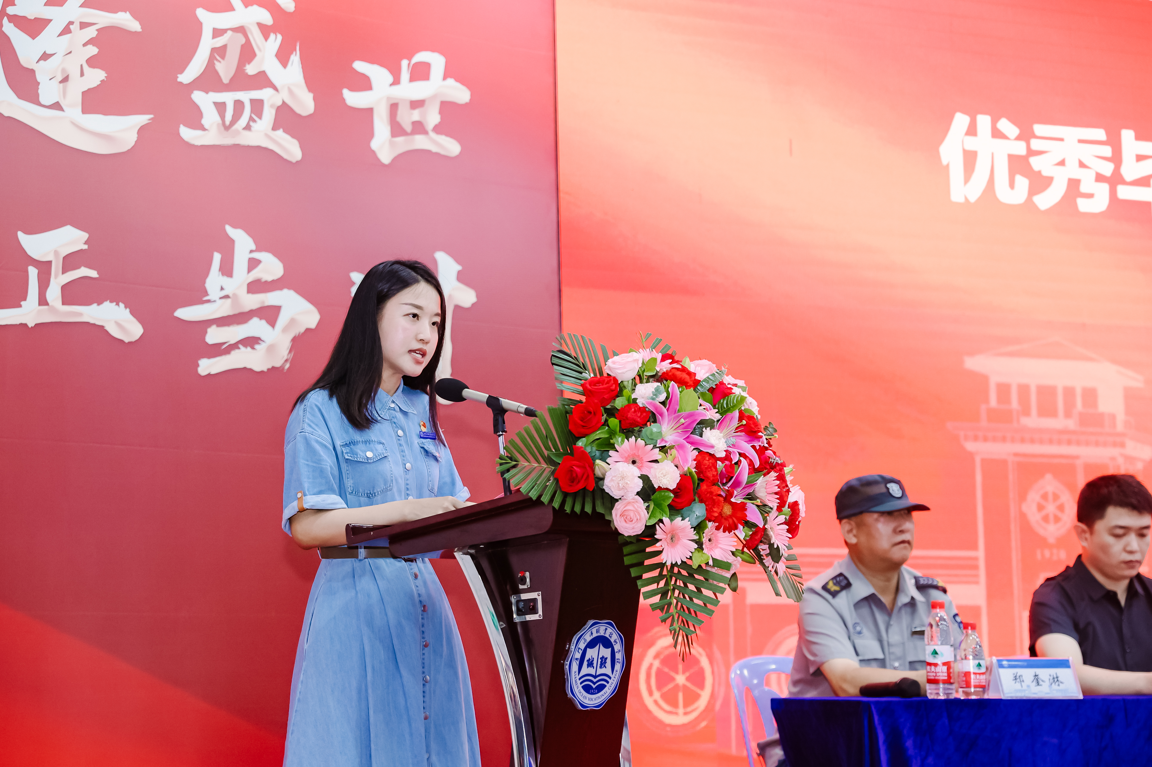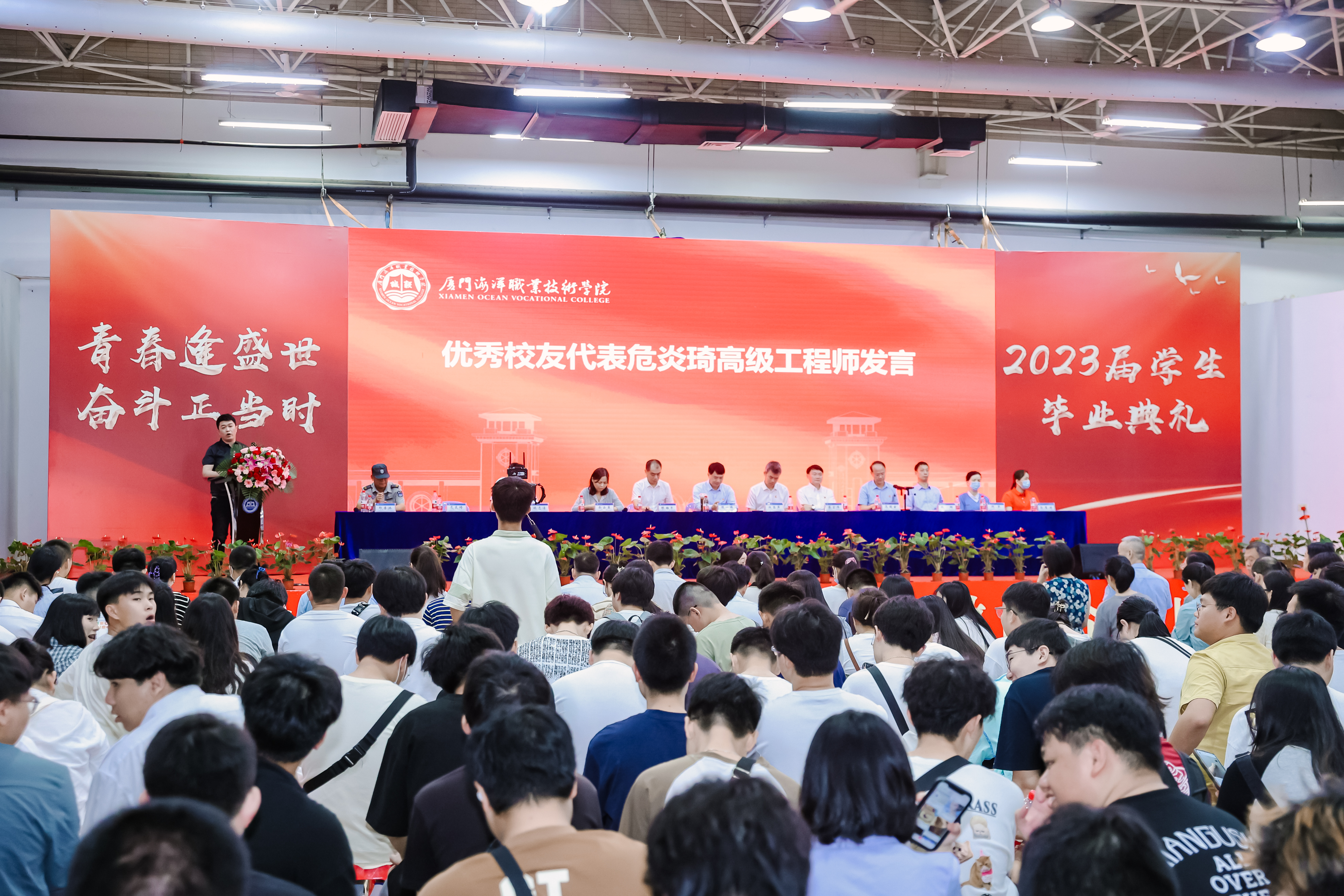 教师代表、毕业班辅导员廖宇琛寄语毕业生,做一个懂得坚持的人,迎难而上,绝不言弃;做一个内心强大的人,保持理想,坚守初心。做一个不断学习的人,累积知识,堆砌生命的厚度。毕业生代表刘益君感恩母校与师长,祝福青春与未来。刘益君曾投身火热军营,退伍后返校学习,专业成绩名列前茅,荣获校级多项荣誉,获得了优秀毕业生称号。校友代表、福鼎时代新能源科技有限公司高级工程师危炎琦分享了他在海院求学时候的美好时光,并结合自身学习、工作经历,勉励学弟学妹们要牢记“诚毅”校训,努力耕耘,在未来的日子里厚积而薄发。