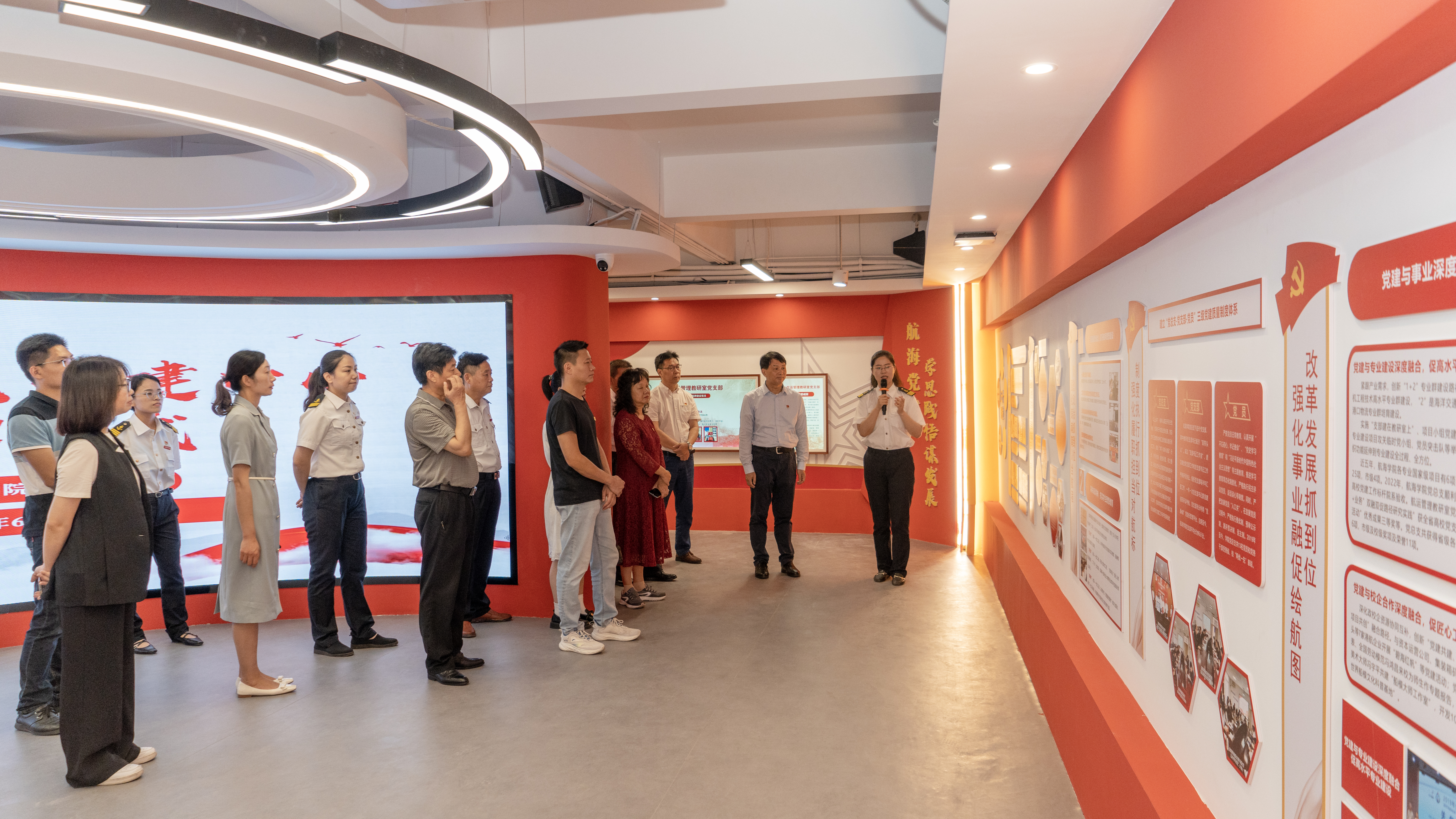 航海学院党建中心总面积422平方米,以“航海蓝+党建红”为基底,是集志愿服务、管理、展示、教育于一身的开放式、多功能的党建工作综合平台。
