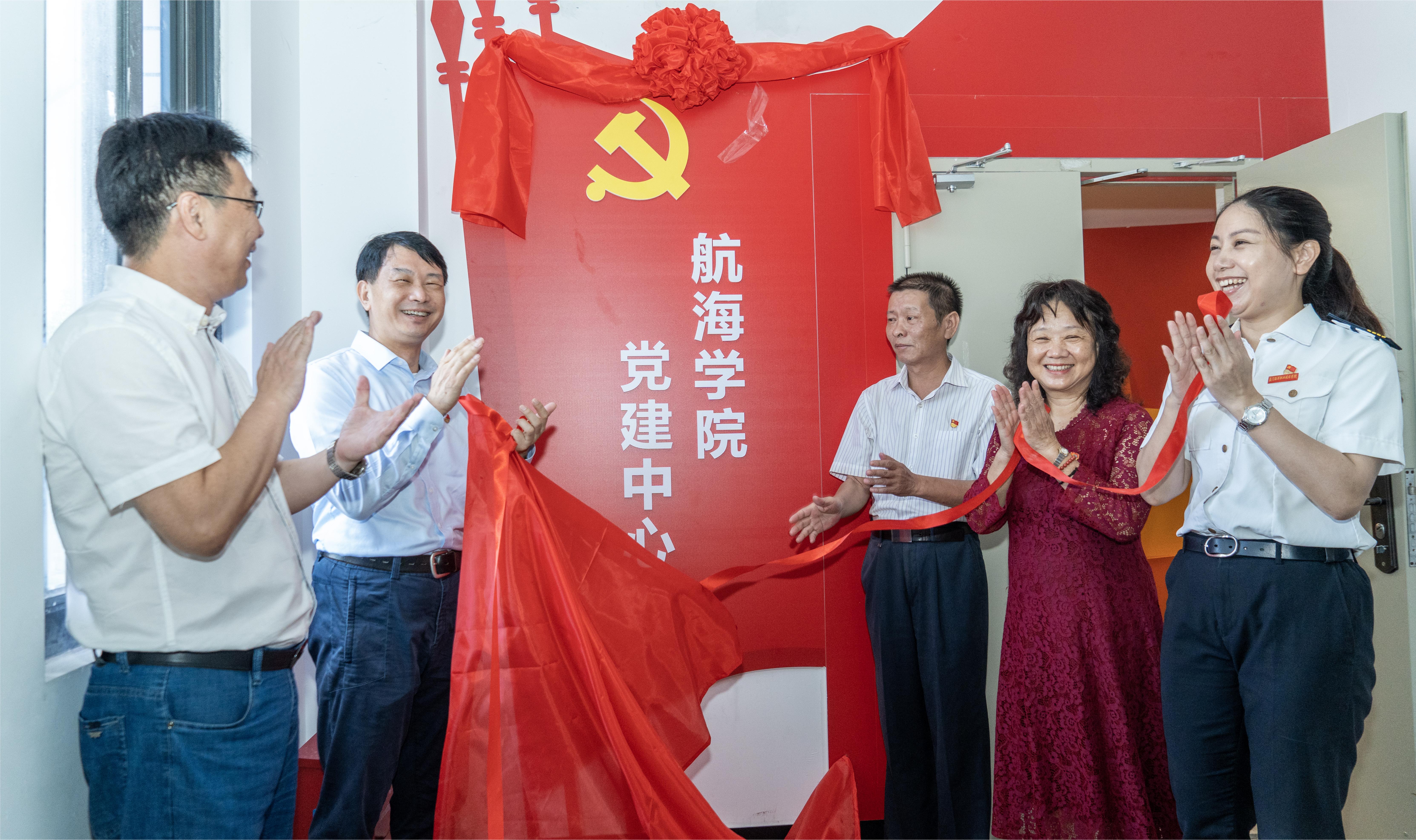 现场,陈一端与航海学院历任党总支书记为航海学院党建中心揭牌。