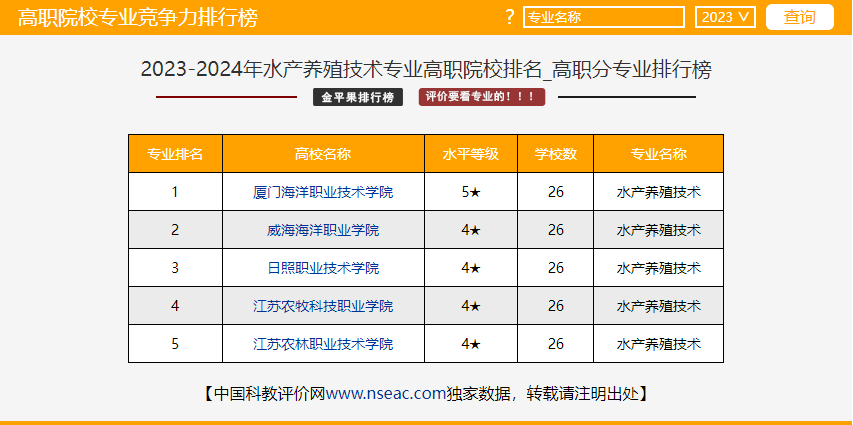 我校渔业类专业在“金平果”发布的2023年高职院校专业类竞争力排行榜中连续四年位列第一!水产养殖技术专业在高职院校专业竞争力排行榜中同样取得第一名。