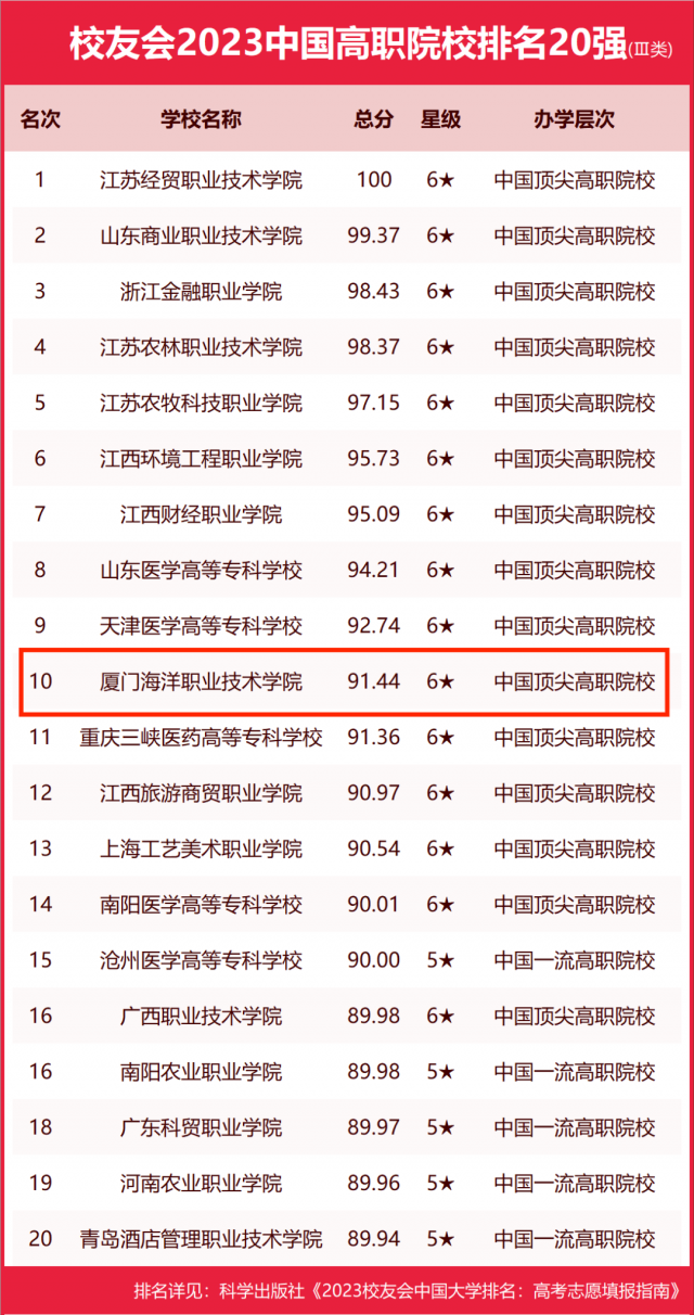 近日,全国第三方大学评价机构艾瑞深校友会网正式发布《校友会2023中国大学排名:高考志愿填报指南》。我校以91.44分的总分位列2023全国高职院校(Ⅲ类)第10位,较2022年提升4位,较2021年提升35位,排名位次连续三年蝉联福建省第一,首次进入校友会2023中国高职院校排名Ⅲ类全国10强。