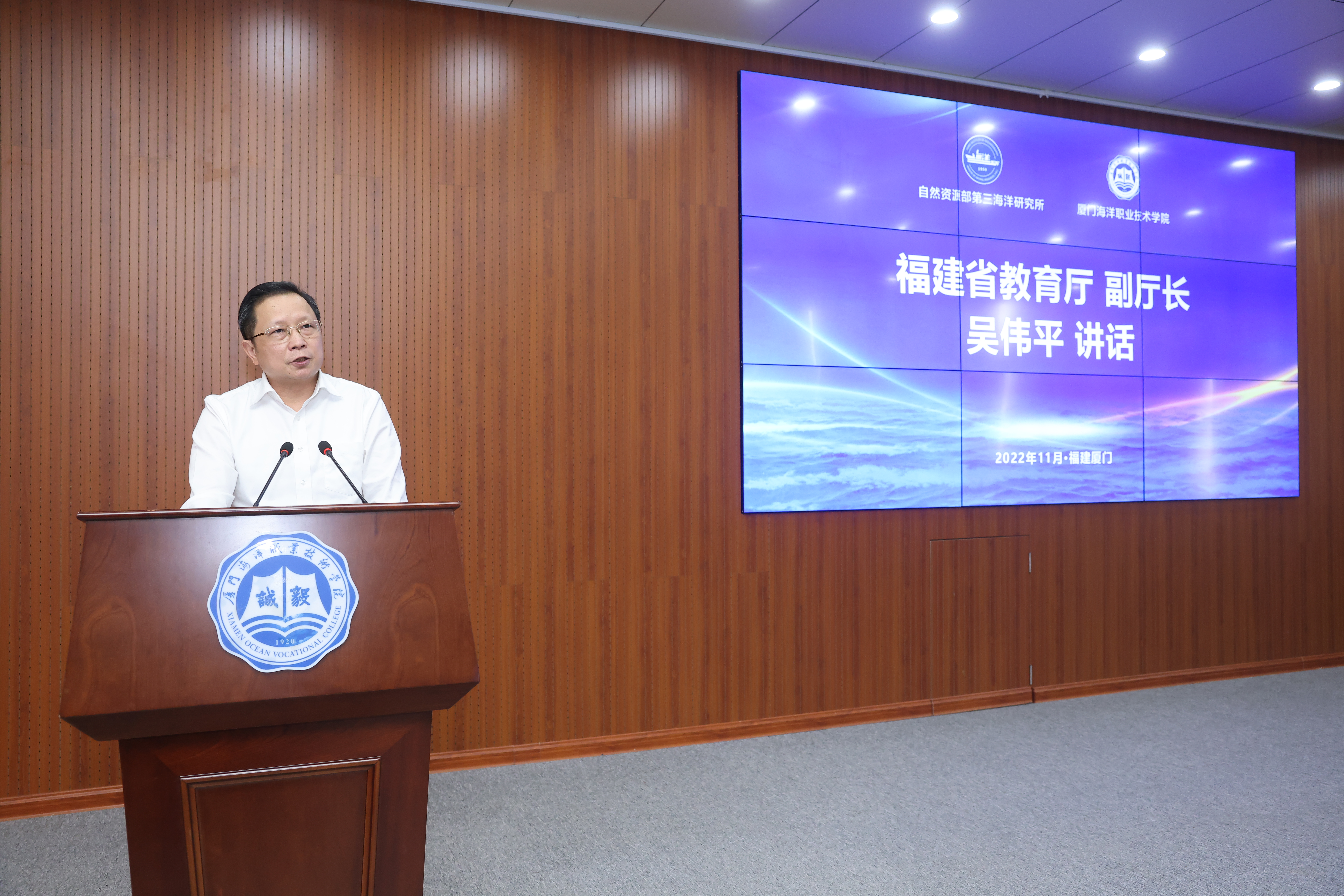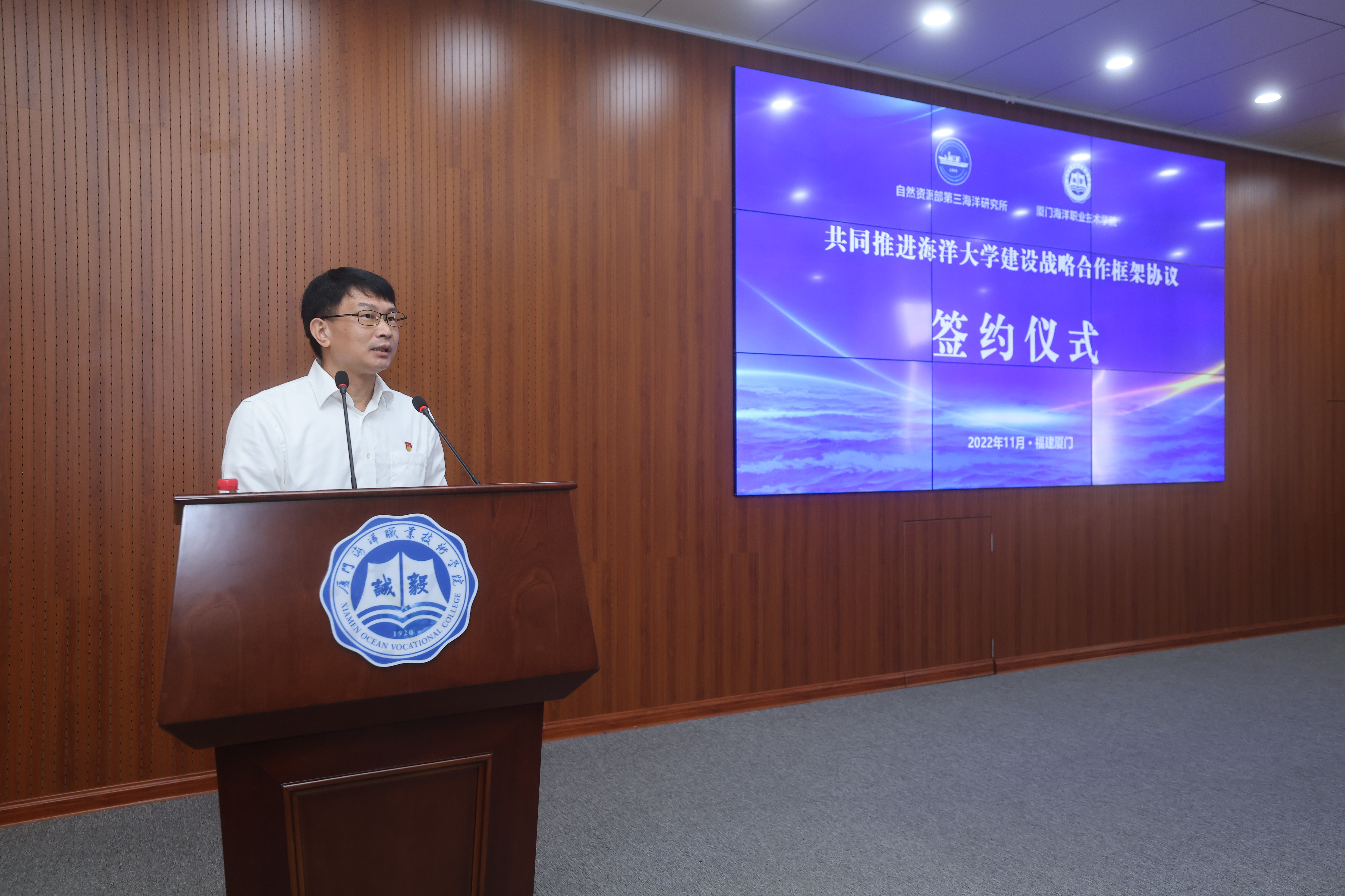 今天上午,厦门海洋职业技术学院与自然资源部第三海洋研究所(以下简称“海洋三所”)签署合作协议,共同推进高水平职业教育类型海洋大学建设。福建省教育厅副厅长吴伟平、厦门市教育局局长陈珍、自然资源部第三海洋研究所所长蔡锋,学院党委书记陈一端、院长陈昌萍出席签约仪式。