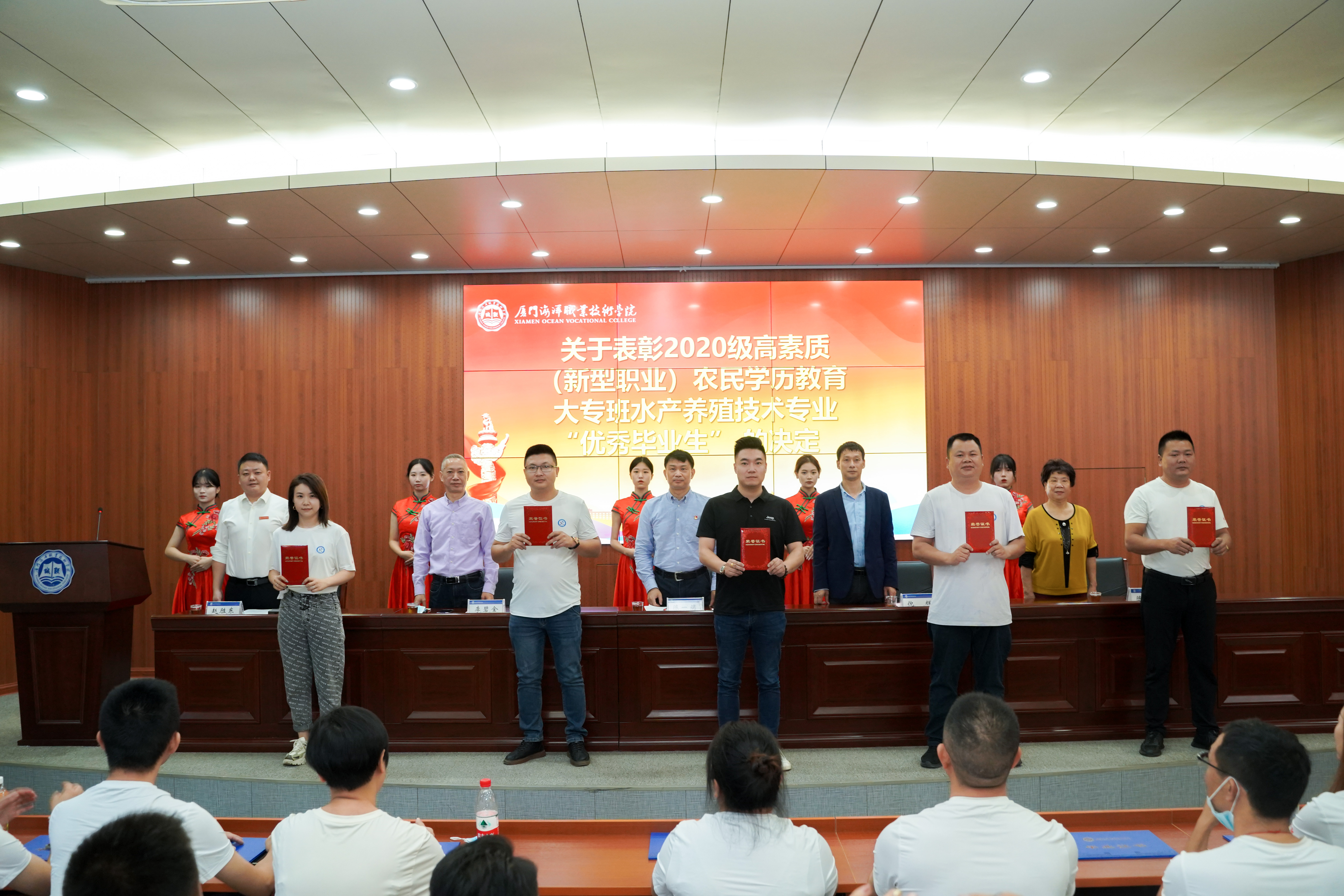 继续教育学院、教务处、海洋生物学院、校友会相关负责人,教师代表与2020级高素质(新型职业)农民大专班学员代表共150多人参加毕业典礼。