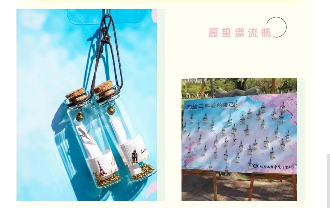 信息工程学院为新生们准备了“愿望漂流瓶”,2022级萌新们写下愿望给“三年后的自己”。闪闪亮的漂流瓶,承载着一个个充满向上的愿望,希望三年后同学们的愿望都能实现。