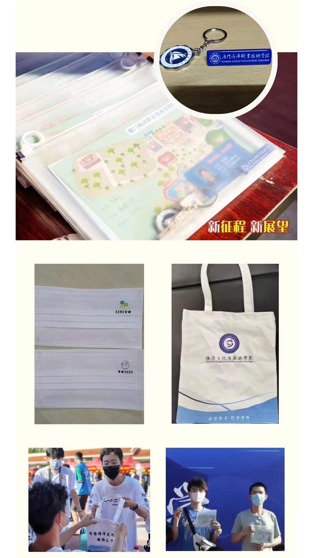 为你准备的礼包,点亮新的行程路。一个海洋蓝的校徽,是你作为海院学子的标志;一份精心绘制的地图,是我们为你引导的方向;一把带有特色扣的钥匙,是我们为你守护的新家;一个印有班级名称的口罩,是新集体对你的召唤;一个暖心设计的帆布包,将陪伴你去看海院的春樱夏荷秋枫冬阳……