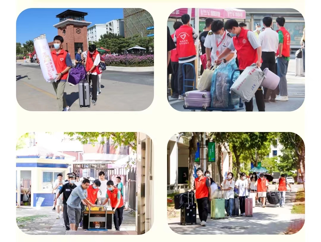 接过你的行囊,我们就是一家人。2022级新同学刚踏入校园,早早等候在校门口的海院“志愿红”学长学姐们,热情接过新同学行李,指引他们到新时代广场迎新大本营报到,做好入校登记,分发入校物品,护送新同学前往宿舍。