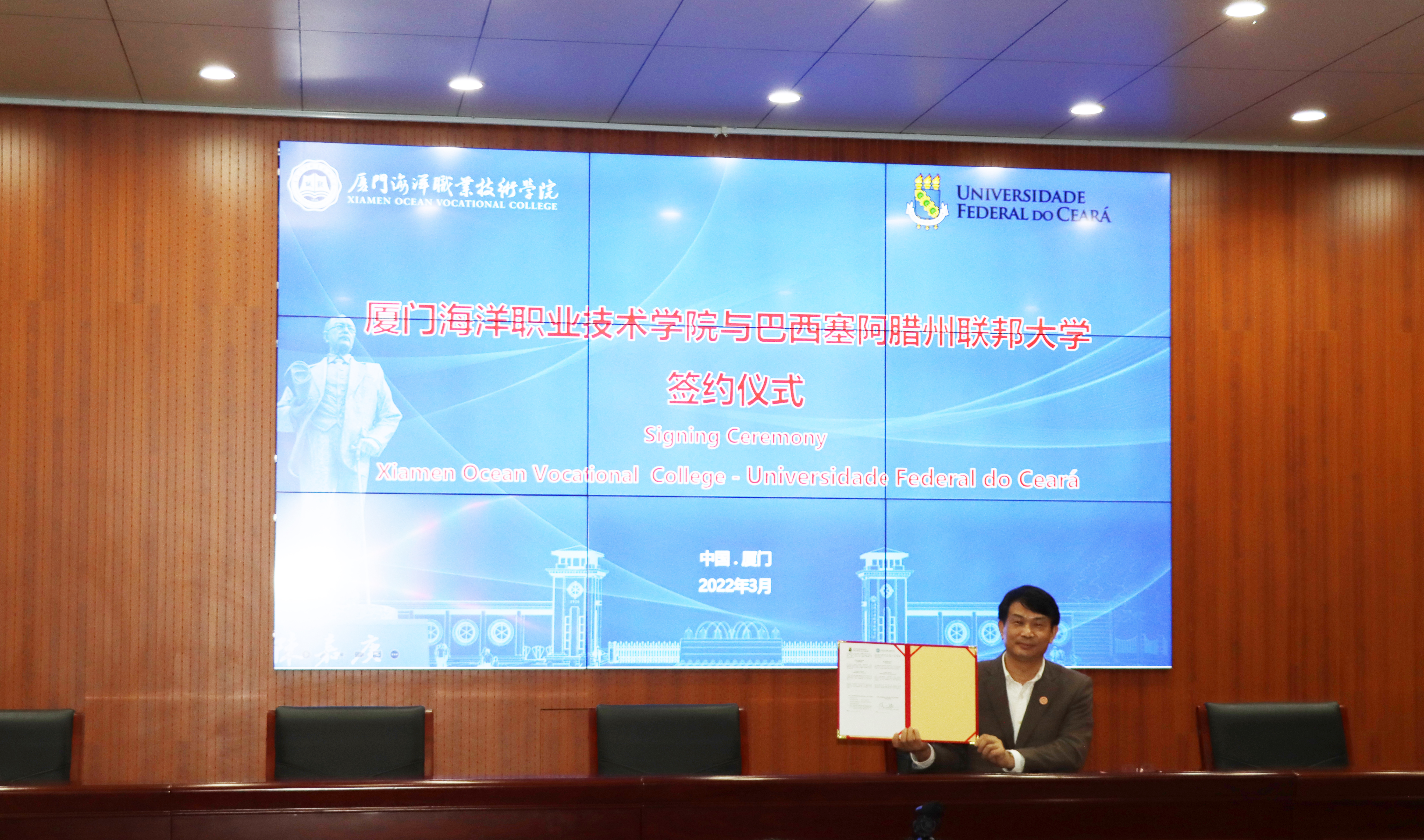 我院校方代表陈一端在讲话中提出,厦门海洋职业技术学院与巴西塞阿腊联邦大学签订合作协议,是进一步贯彻落实习近平总书记“一带一路”倡议重要论述和来闽考察重要讲话精神的重要举措。学院将积极依托海洋办学特色,与签约校在师生交流、科研协作、学术交流等领域开启多层次务实合作。