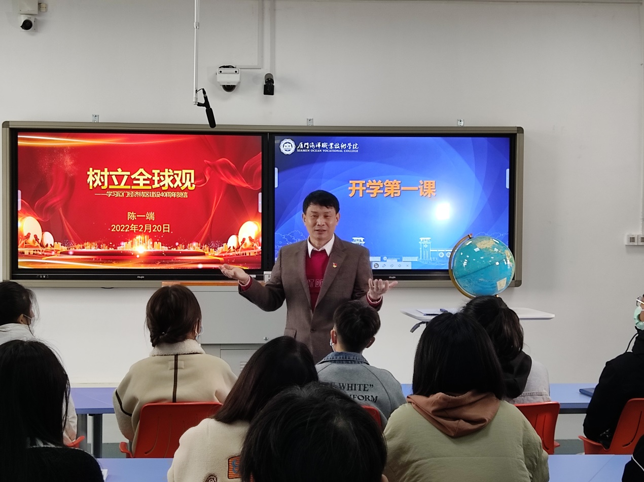 新学期、新希望、新征程,校党委书记陈一端以“树立全球观——学习厦门经济特区建设40周年贺信”为题录制“开学第一课”。2月22日,全体第一堂课授课老师开展带班学习。