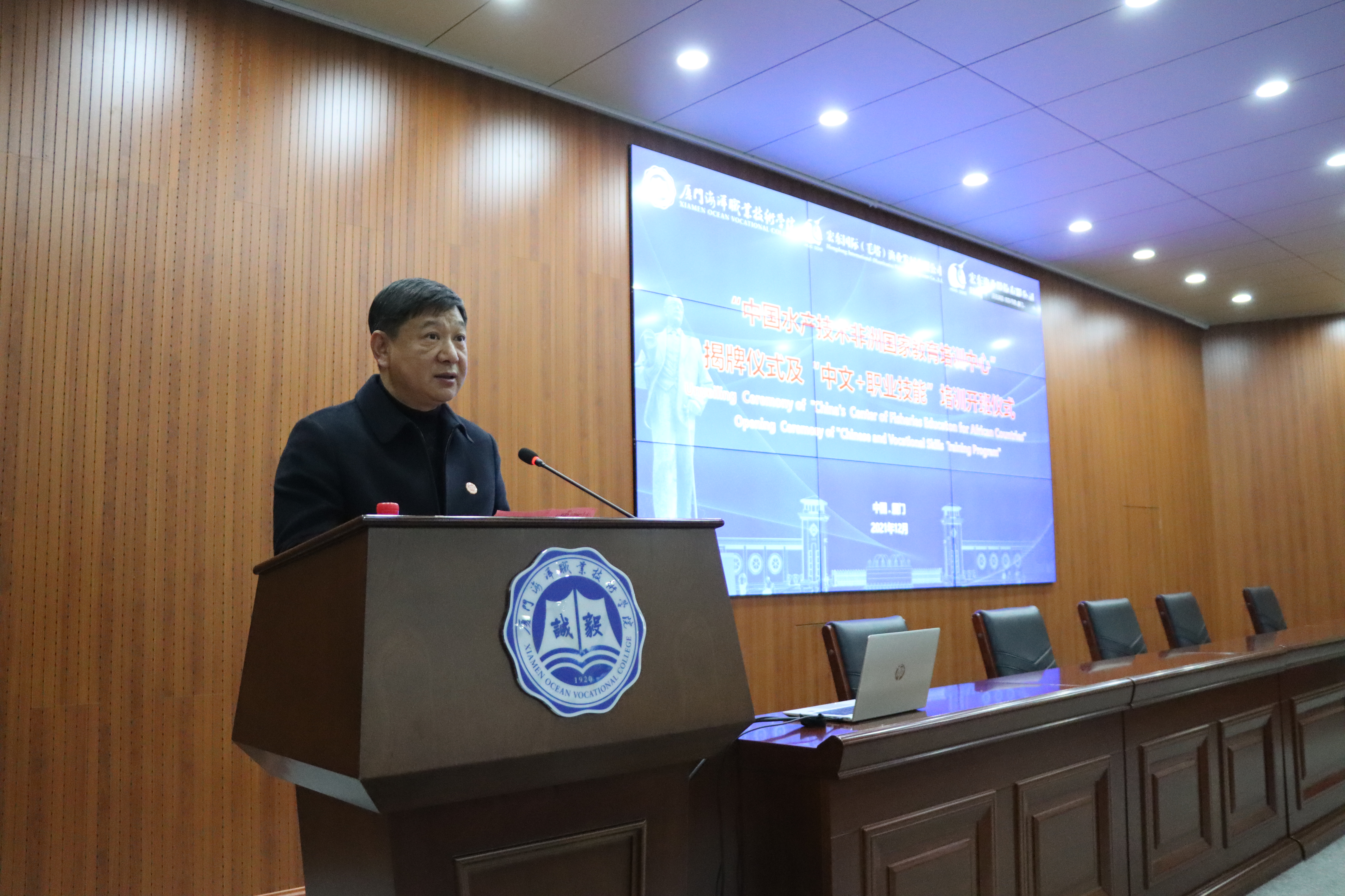 陈一端致辞并宣布成立“中国水产技术非洲国家教育培训中心管理机构”的决定。他指出,此次“中心”正式揭牌,是我校进一步贯彻落实习近平总书记“一带一路”倡议重要论述和来闽考察重要讲话精神的重要举措,是我校建设“国内领先、国际一流”高水平海洋职业大学的重大标杆性特色项目。我校将围绕海洋生物、智慧渔业、国际航运、海洋信息、海洋工程等优势领域,开发针对非洲国家发展需求的各类职业教育培训课程,开展多层次、多领域人才培养。