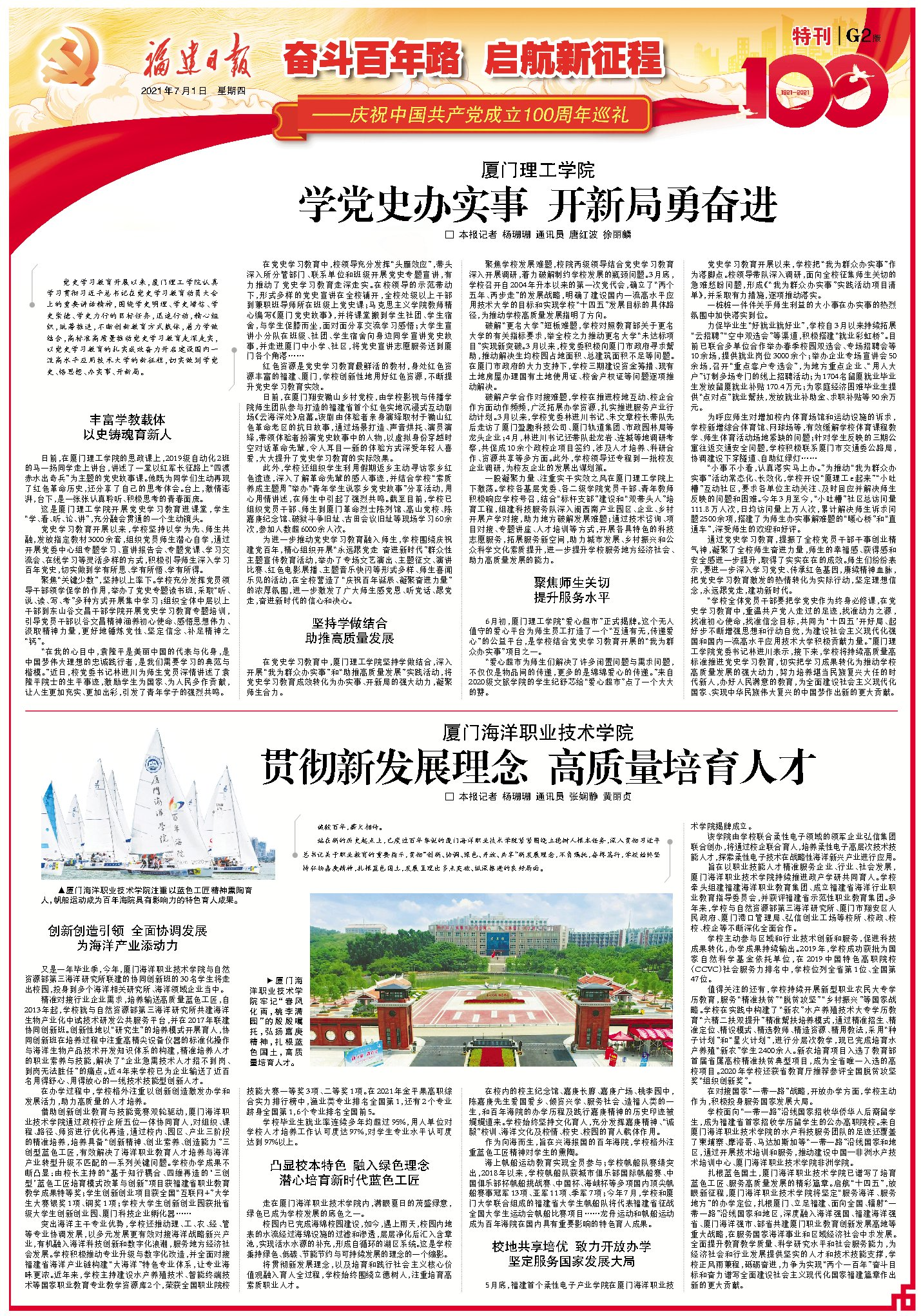 站在新的历史起点上,已度过百年华诞的厦门海洋职业技术学院紧紧围绕立德树人根本任务,深入贯彻习近平总书记关于职业教育的重要指示,贯彻“创新、协调、绿色、开放、共享”新发展理念,不负嘱托,奋楫笃行,学校始终坚持弘扬嘉庚精神,扎根蓝色国土,发展呈现出多点突破、纵深推进的良好局面。