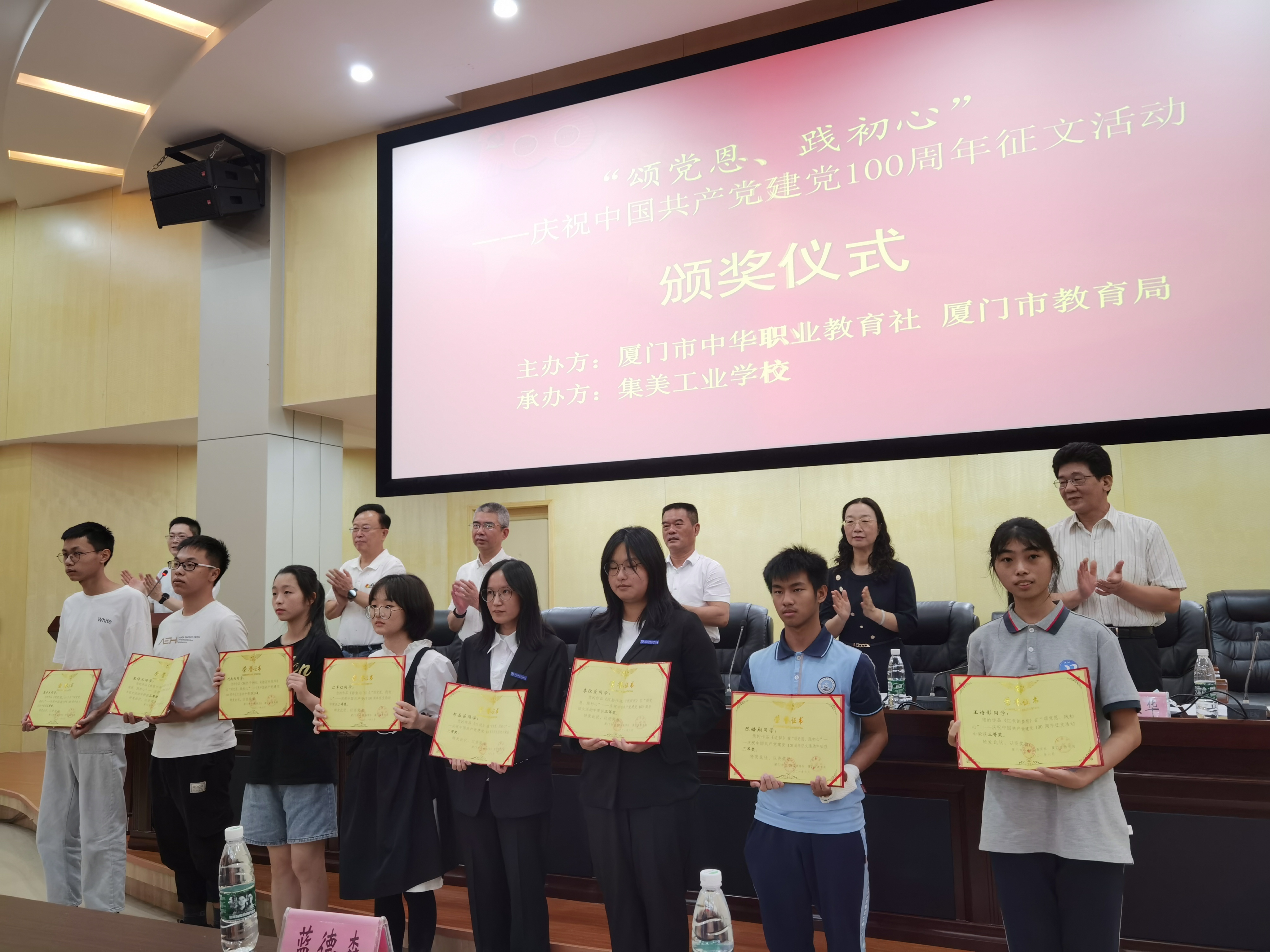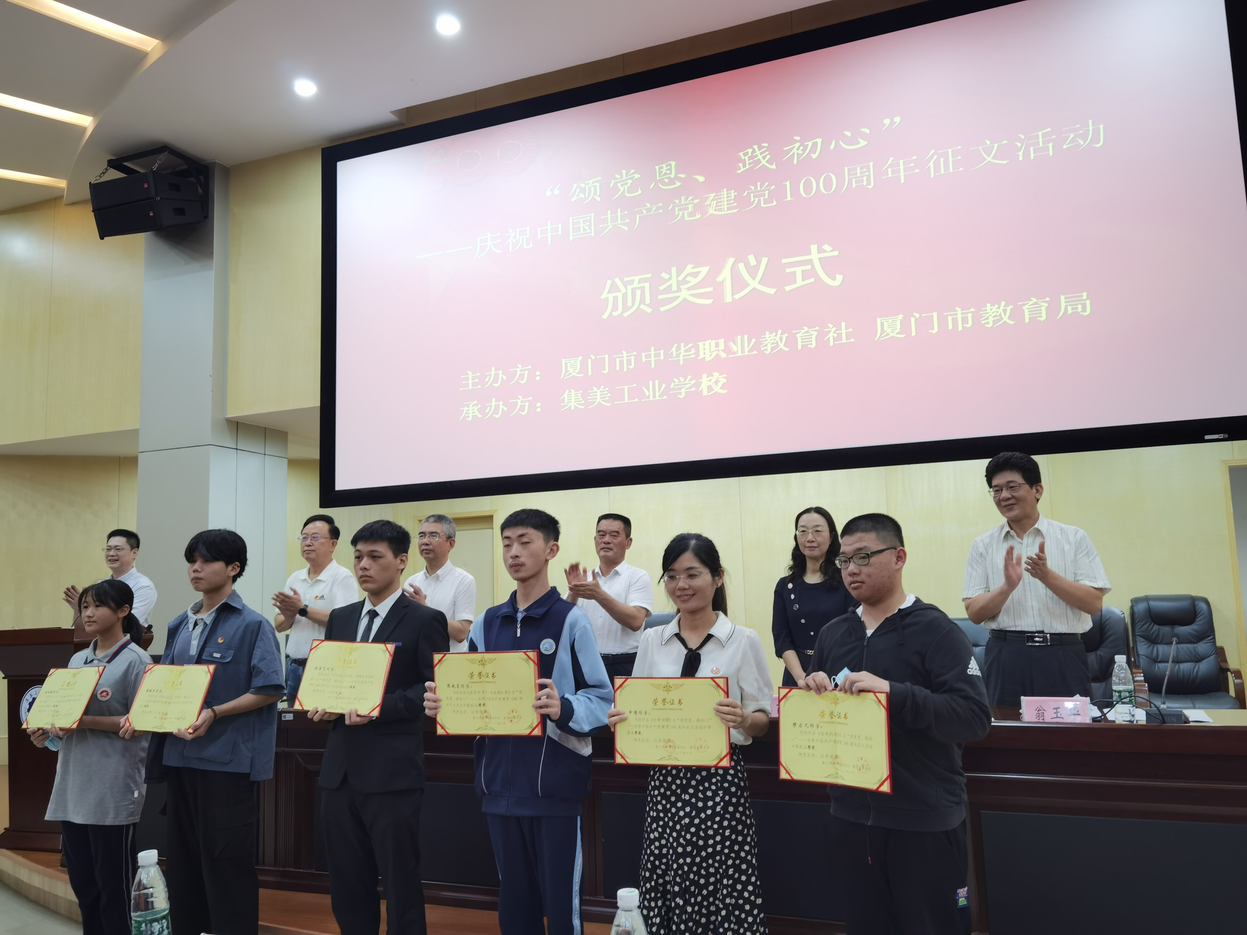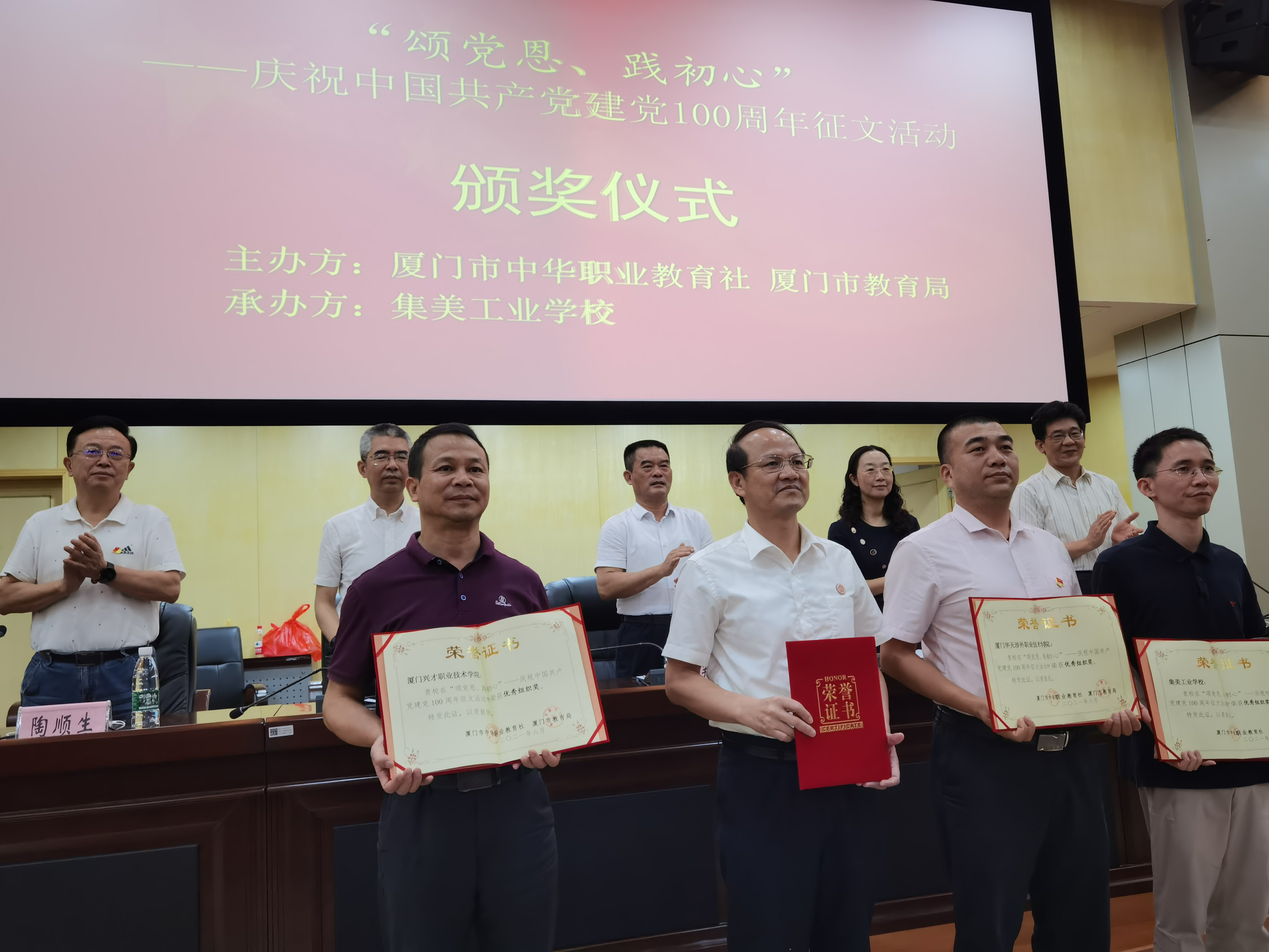 6月30日,厦门市中华职业教育社、教育局主办“颂党恩,践初心”庆祝建党百年主题征文活动颁奖仪式在集美工业学校举行。我校海洋机电学院辅导员申倩老师等师生创作的《四季颂歌》等6篇作品获奖,其中二等奖2篇、三等奖2篇,优秀奖2篇,学校被授予活动优秀组织奖。校党委委员、副校长马国玄率队参加颁奖仪式。