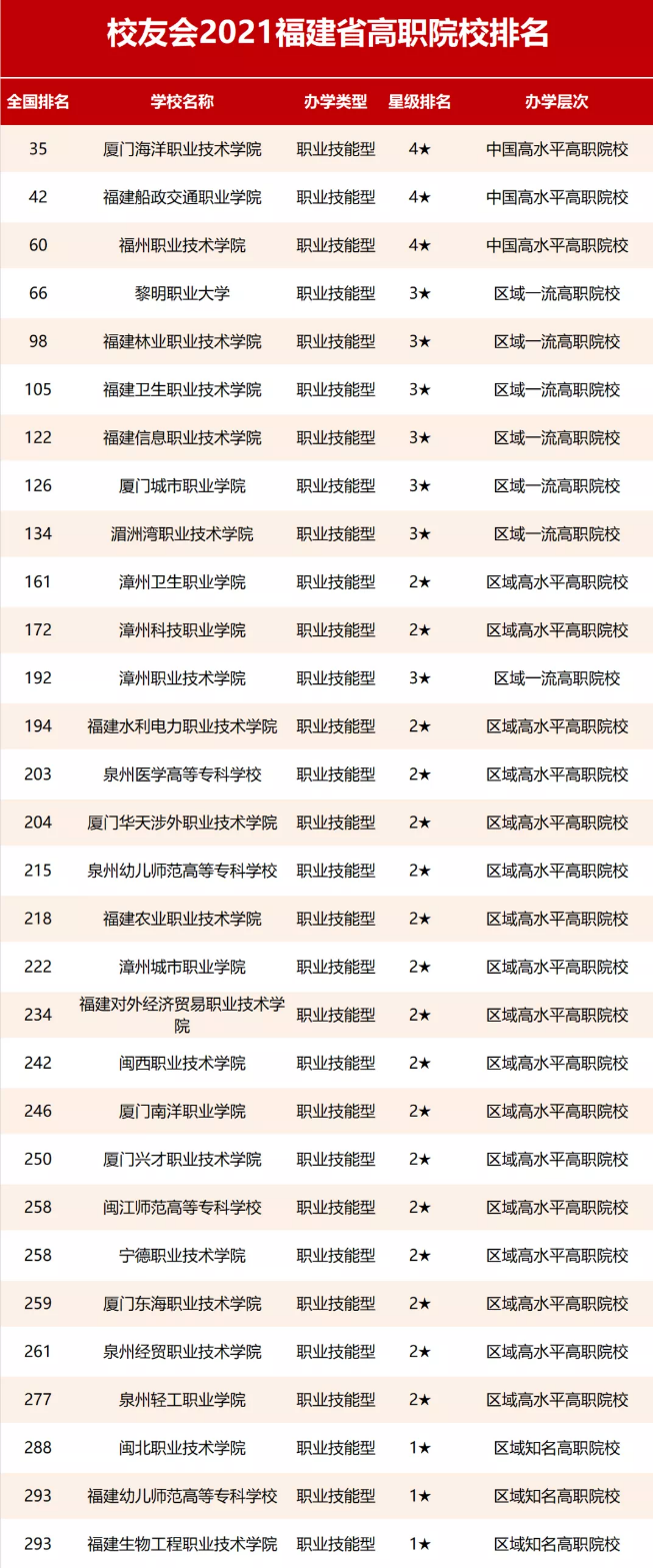此次,我校以86.96分的总分在“2021校友会中国高职院校排名(Ⅲ类)”中位列第35位,是福建省分类排名位次最高的高职院校,也是本次排名中获得4星级评价的福建省三所高职院校之一,获评为该排行“中国高水平高职院校”称号,为历史最好排名成绩。