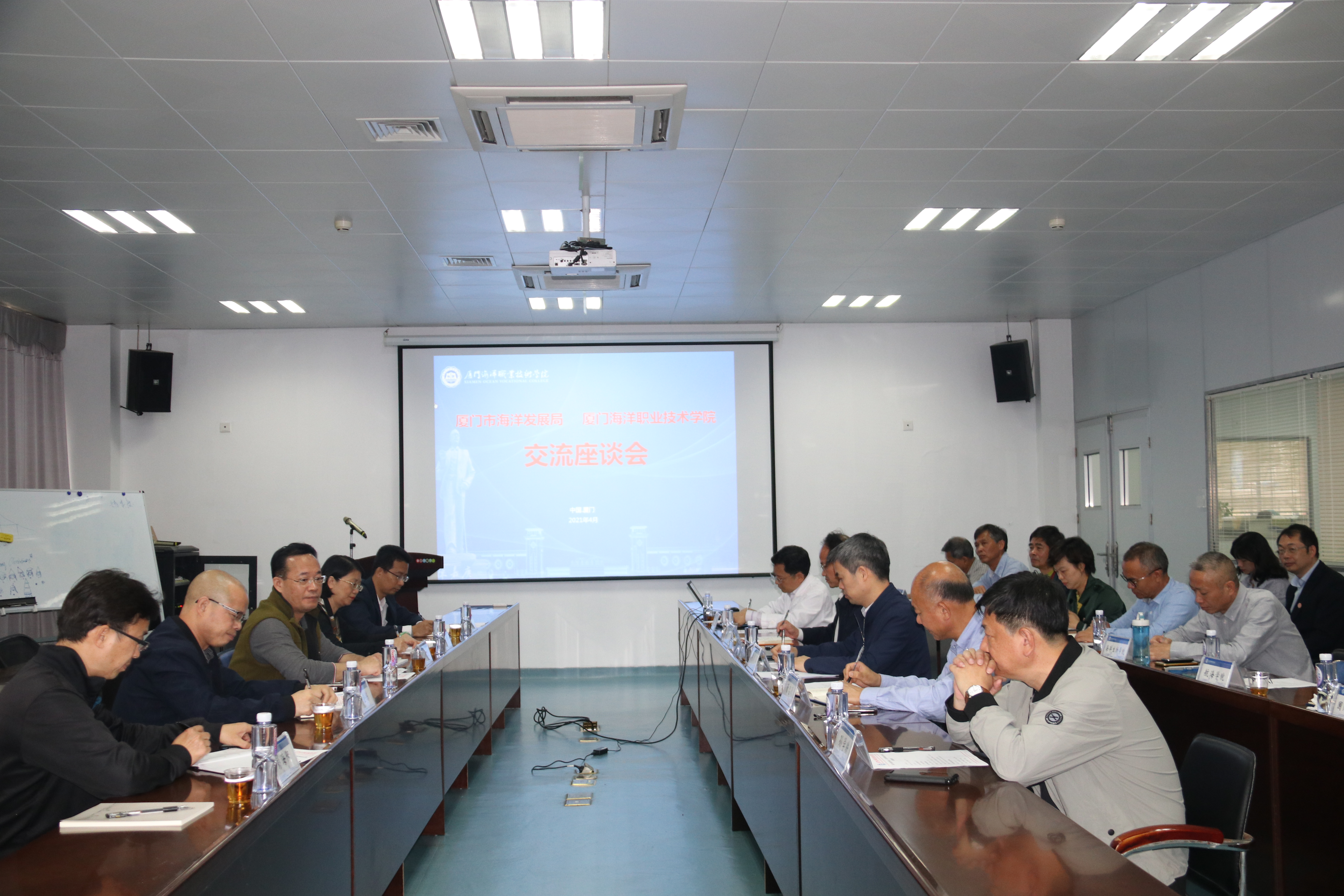 厦门市海洋发展局办公室、渔业发展与质量监督处、厦门市海洋与渔业研究所、厦门南方海洋研究中心相关负责人,我校科研与产教融合处、教务处、人事部、招生就业处、党政办公室、发展规划与质量管理处、海洋生物学院、航海学院、国际商贸学院负责人参加交流。