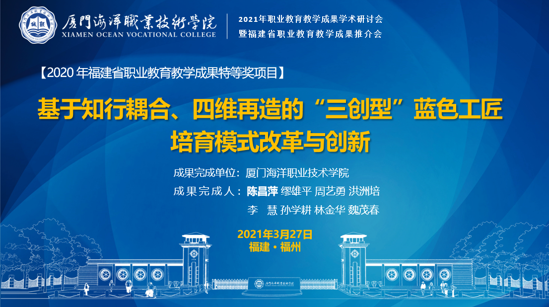 3月27日-28日,中国职业技术教育学会2021年职业教育教学成果学术研讨会暨福建省职业教育优秀教学成果推介会在福州召开。我校省级教学成果特等奖项目“基于知行耦合、四维再造的‘三创型’蓝色工匠培育模式改革与创新”作为福建省职业教育优秀教学成果之一,在大会上重点推介。