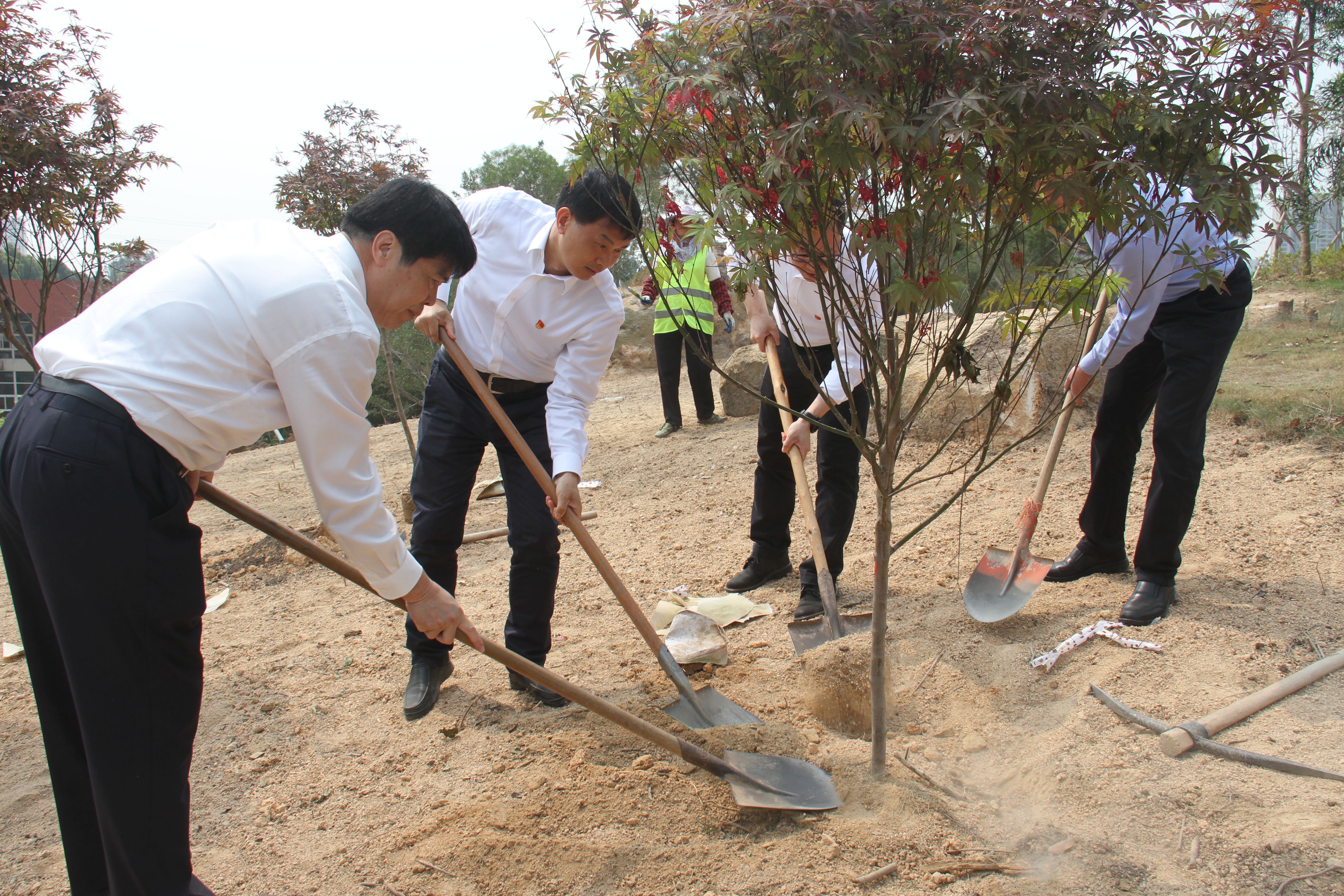 签约仪式后,参会同志走向我校敬贤山共同种下“友谊树”。据悉,我校敬贤山现种植400余株红枫树由本次与我校共建的四家单位联合捐赠,这将打造成为海院的又一张美丽名片——枫树林。