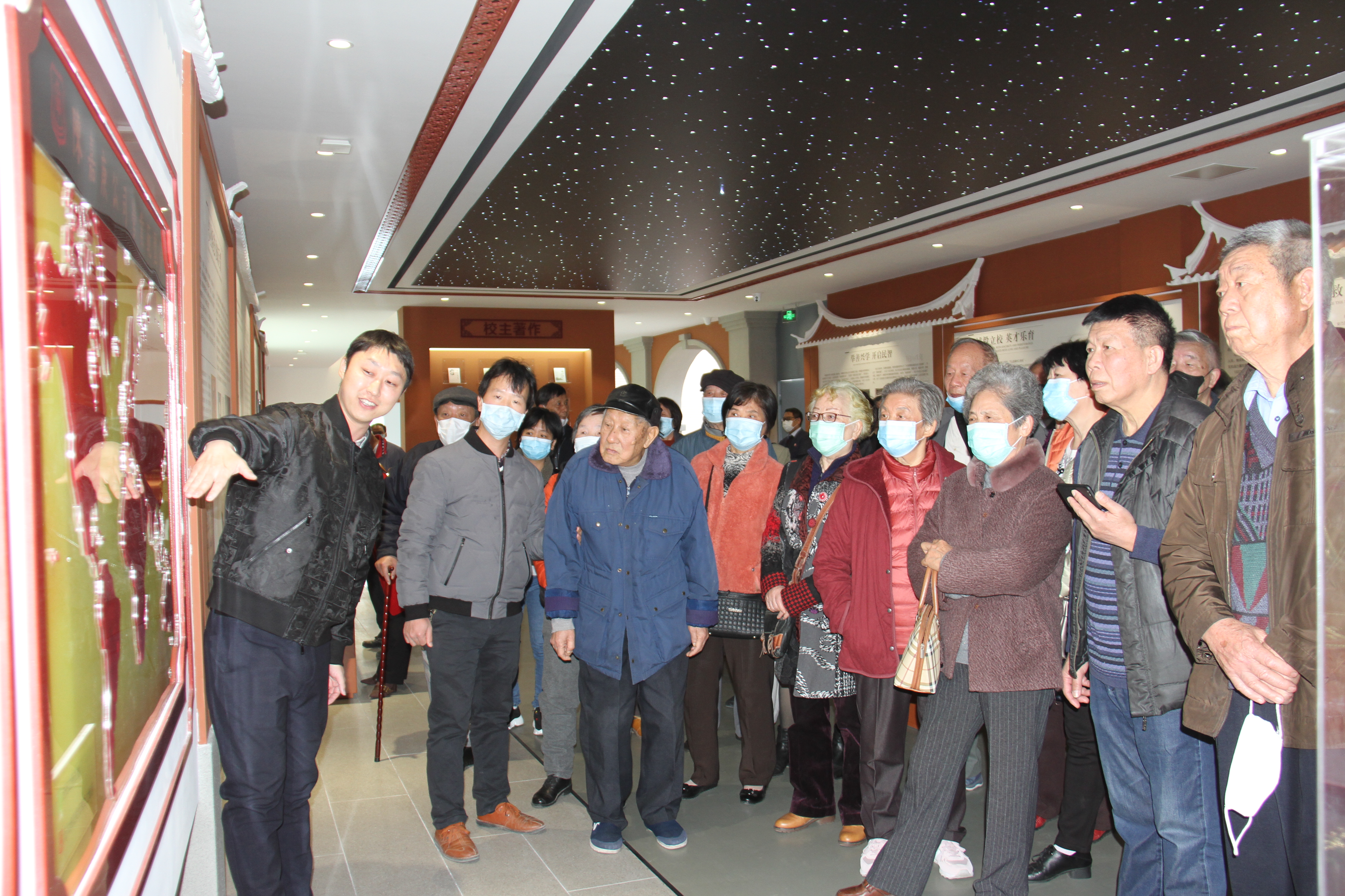 校领导为大家介绍主校门设计构思和寓意,让老同志们倍感温暖,深受感动。大家还参观了新时代广场、校主纪念馆、校史展览馆和世界船模文化展览馆。在校史馆,老同志们找到了亲朋好友的事迹和照片史料,忆往昔岁月,顿百感交集,纷纷拍照留念。