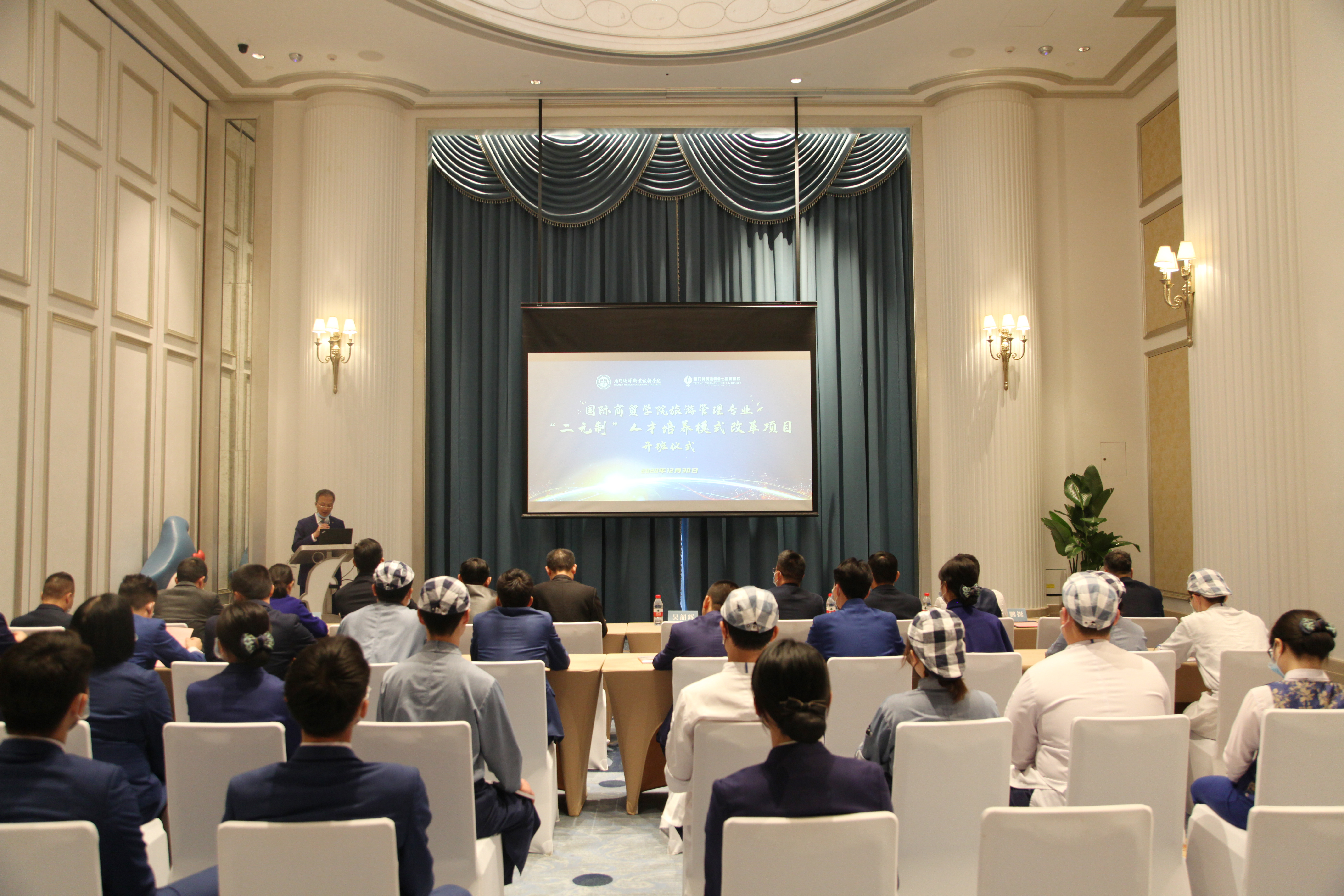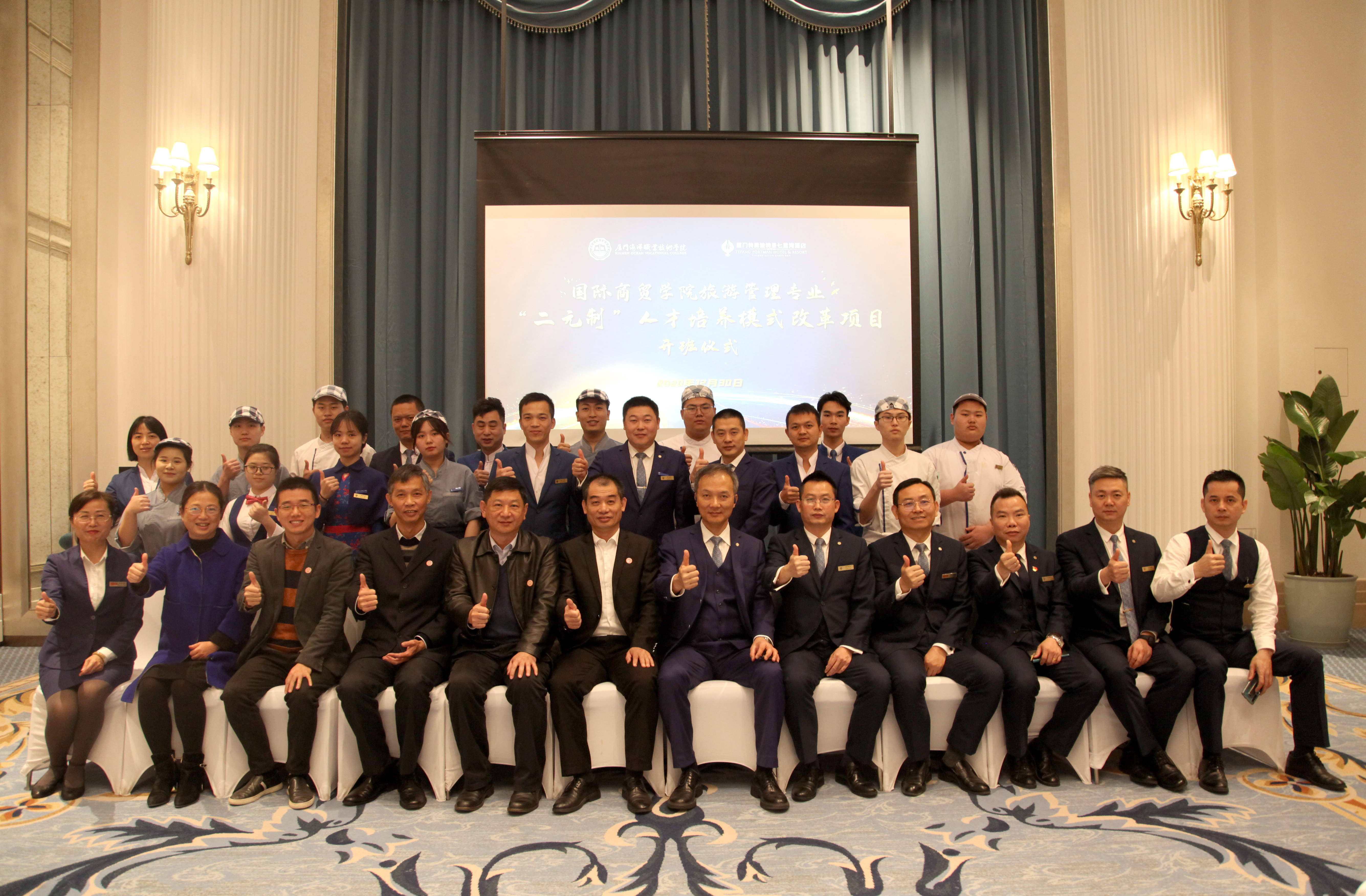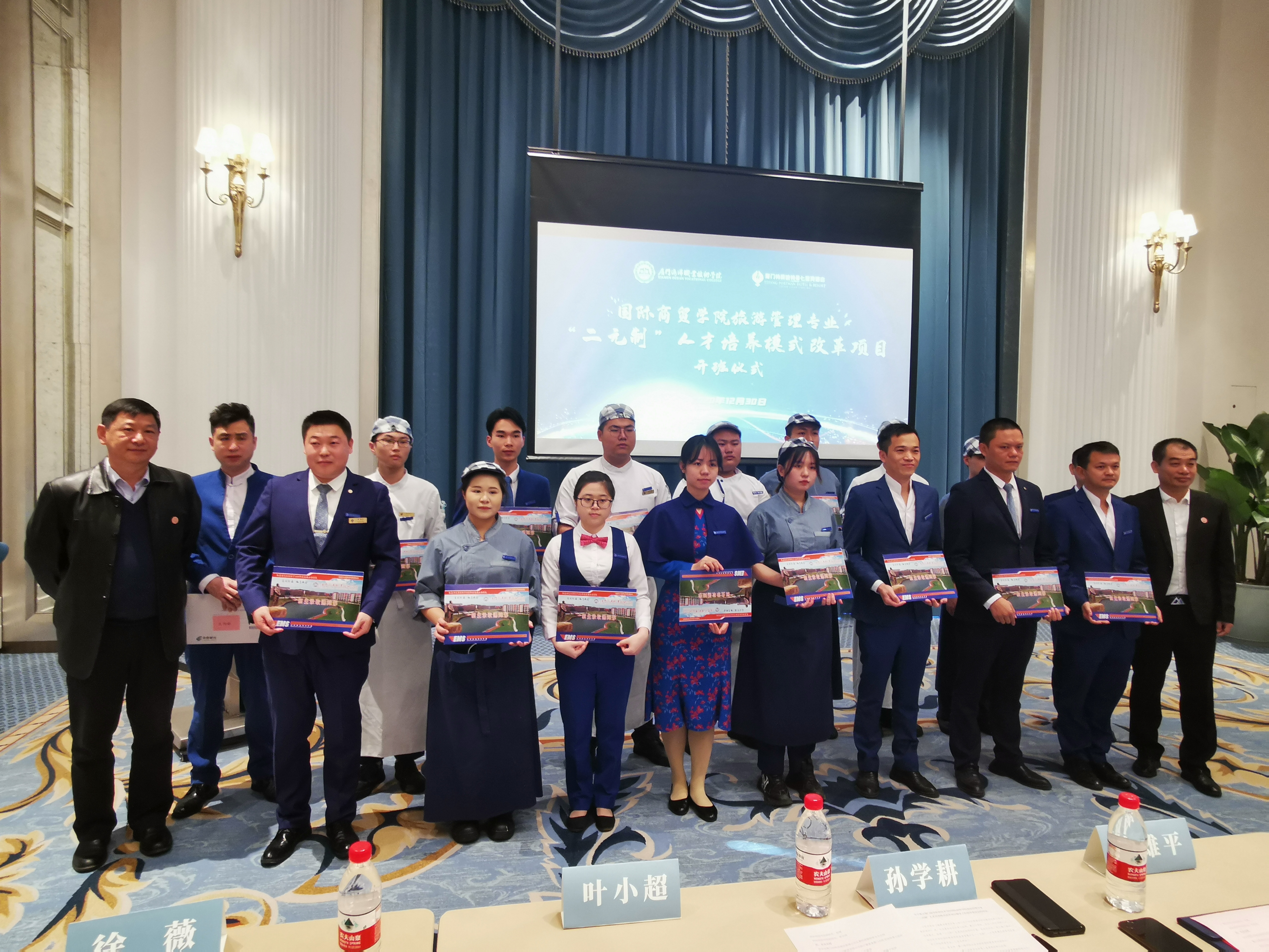 12月30日上午,国际商贸学院与厦门市特房波特曼七星湾酒店有限公司联合开办旅游管理专业“二元制”班在企方开班。本次“二元制”新生班共招生学员17名。企方执行董事兼总经理吴韶辉、校纪委书记缪雄平、副校长孙学耕出席开班仪式。