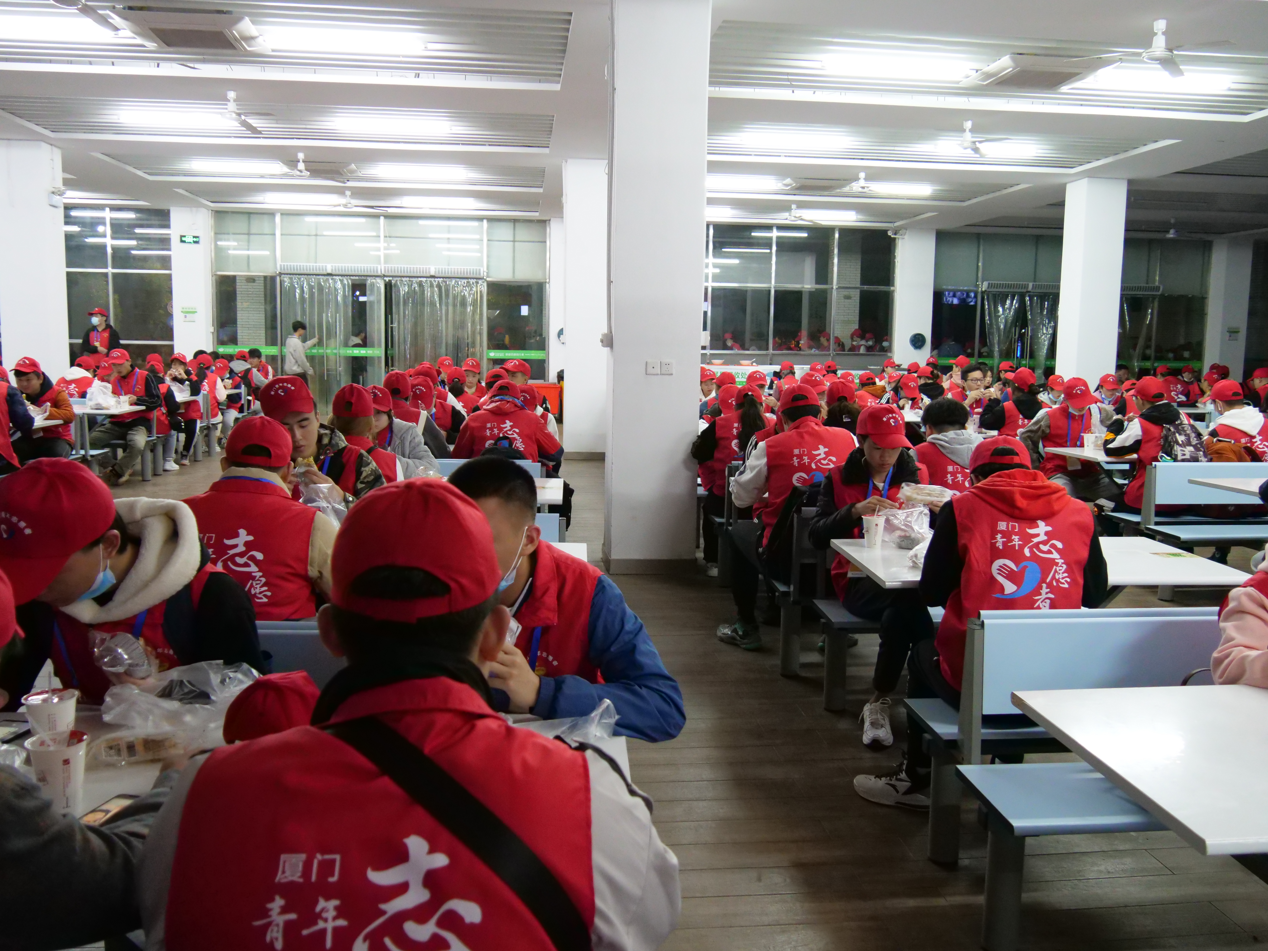 凌晨2:15,海院马拉松志愿者集中在食堂吃“早餐”。冬季的寒风没能阻挡他们,想到即将参与马拉松赛事的服务,他们都抑制不住地激动,精神抖擞、士气昂扬。