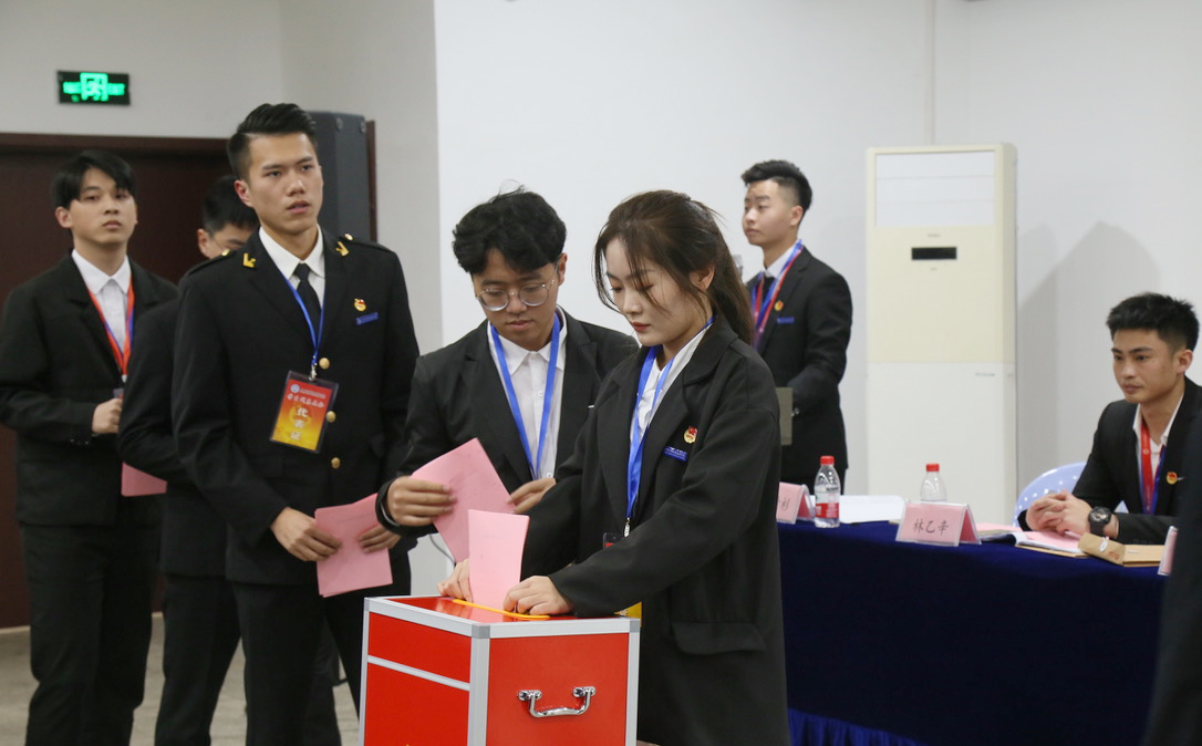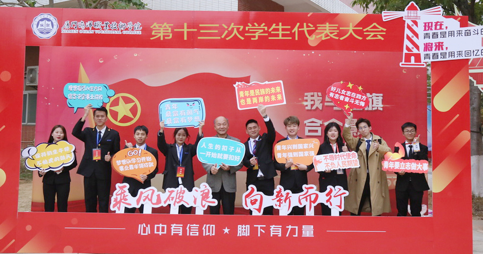 本次会议分为预备会议、正式会议、选举大会和颁发证书四个环节。第十四届学生会主席团执行主席康婉玲同学代表第十四届校学生会作了题为《忆百岁峥嵘踏全新征程乘风破浪向新而行》的工作报告。大会审议并通过了《厦门海洋职业技术学院第十三次学生代表大会选举办法(草案)》《厦门海洋职业技术学院学生会章程》。大会经过全体代表的投票,选举产生了第十五届学生会主席团成员。