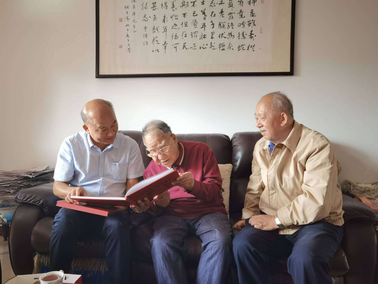 汤忠民通过带去的庆典的视频、画册、图片等向两位前辈汇报了母校百年校的盛况,分享了庆典当天师生校友相聚一堂的一个个感人瞬间。他邀请两位老校友方便时返校参观指导。