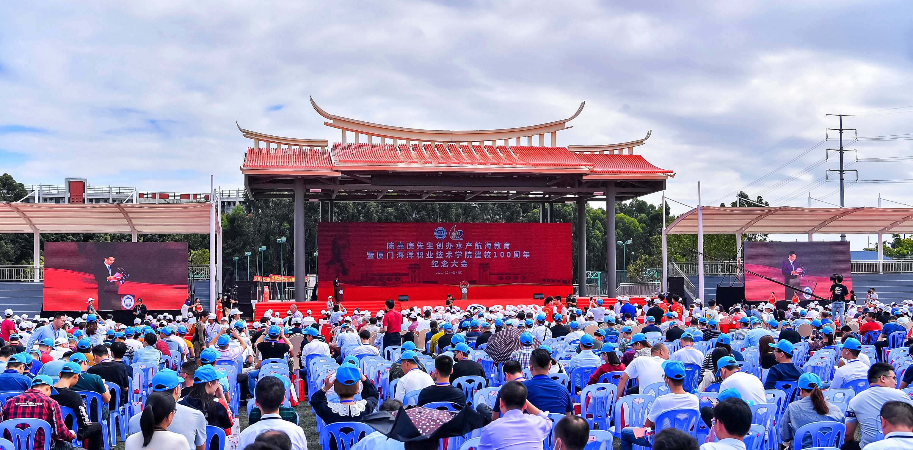 我校党委书记陈一端主持仪式。校长陈昌萍在大会上致辞。他回顾了百年海院发展的沧桑巨变。100年前,民族危难,校主嘉庚先生兴学报国。他秉持“开拓海洋、挽回海权、培育专才”的建校宗旨,在家乡集美创办集美学校水产科,成为我国最早培养水产航海技术人才的摇篮之一,奠定了今日厦门海洋职业技术学院的办学基础。