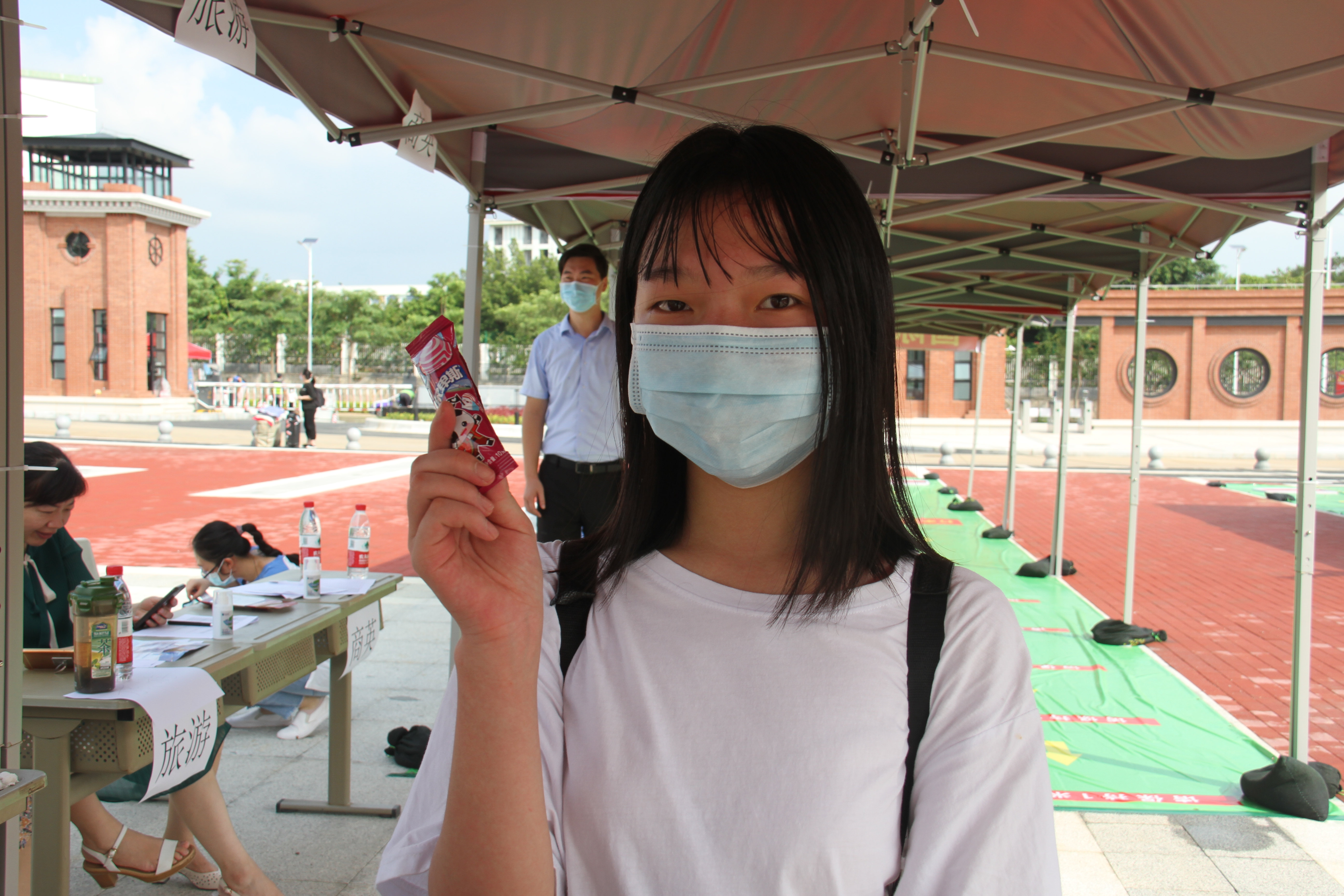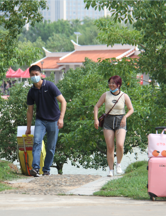 在同学们办理报到手续现场,部分学院贴心地准备了欢迎小礼物,一根棒棒糖、一张小卡片代表了老师们满满的心意。领导、老师、安保人员都陆续加入行李运送志愿队,看着他们湿透的后背随后,养殖3183黄也同学表示:“今天迎来开学第一天,既开心又激动,因为太久没回学校了! 行李很多的我,一进校门就有一位老师帮我拎行李箱,从学校北门一直拎到九号楼宿舍门口,太感动了!谢谢这位老师的热心帮忙!真的太感动了!”