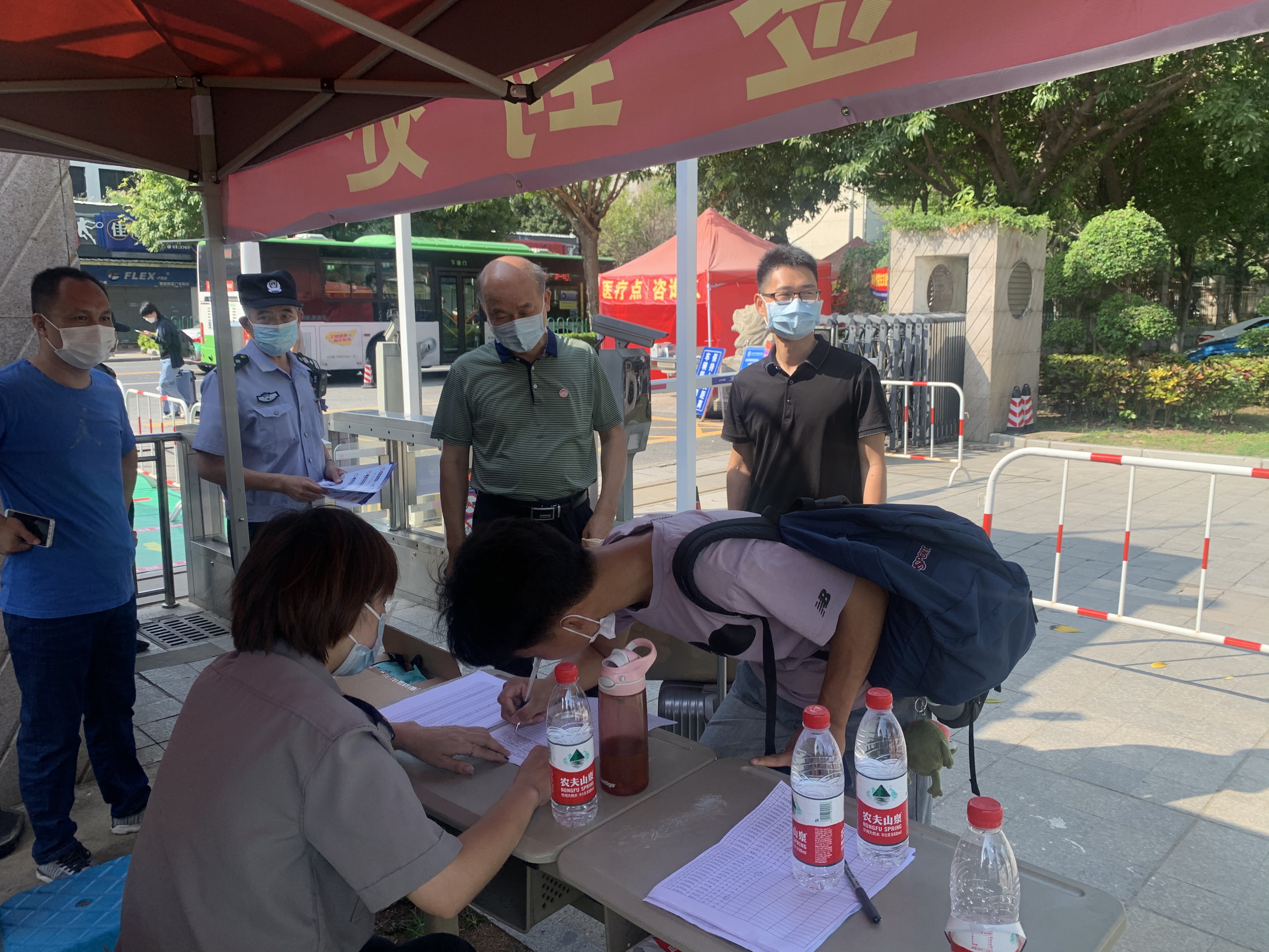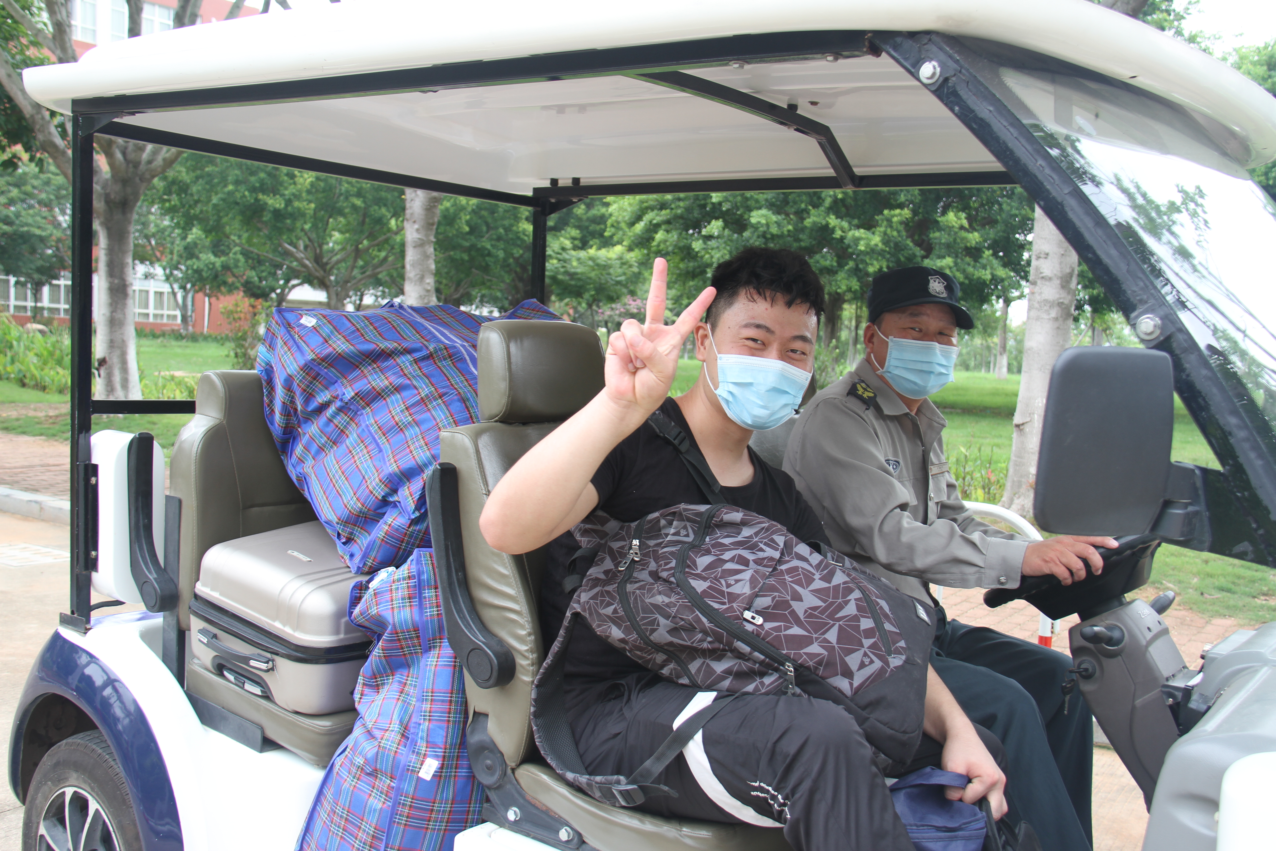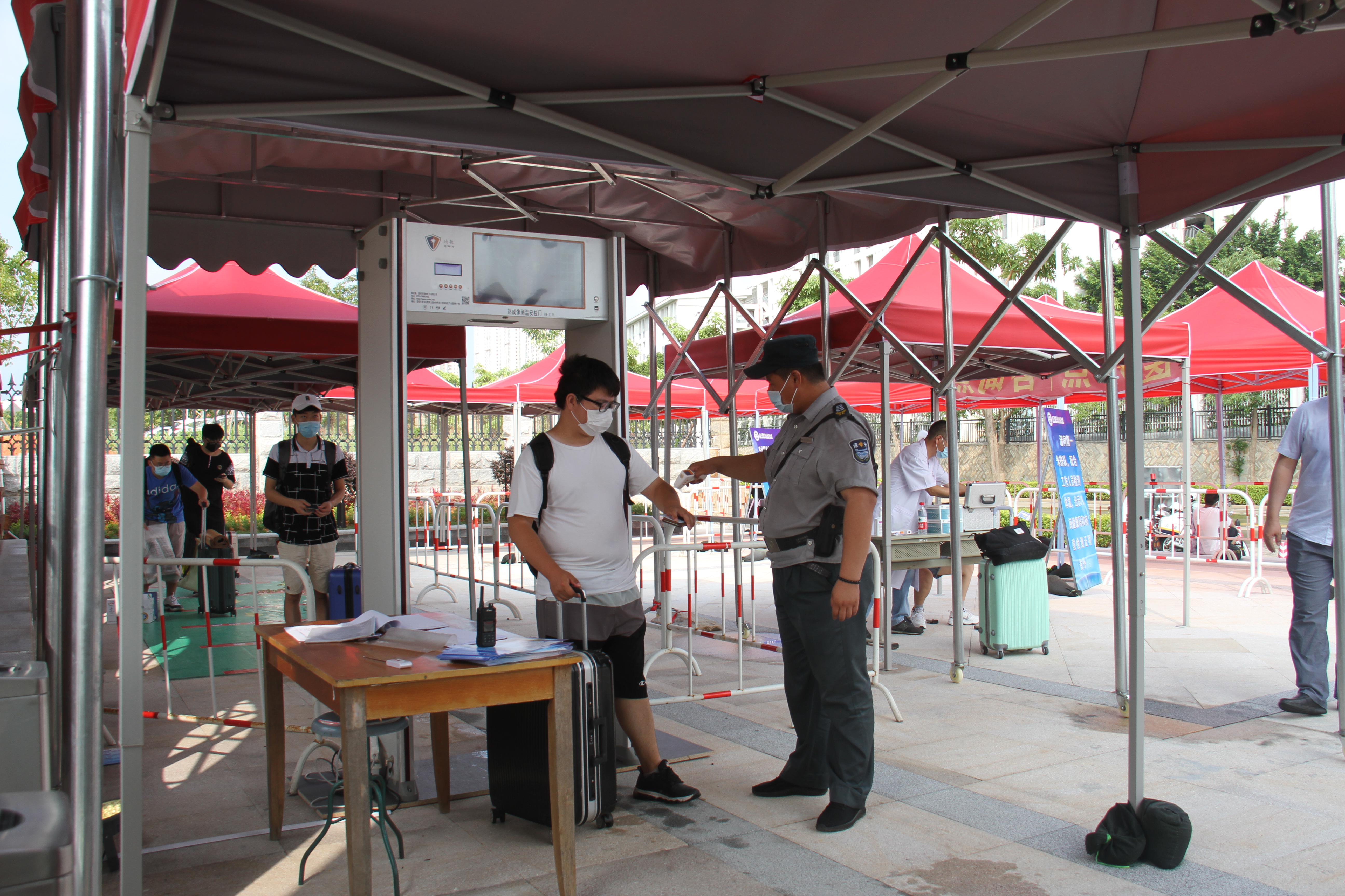各部门、各二级学院相关人员精心筹备到岗,以饱满的热情等候久别的同学。报到现场秩序井然,同学们在候检区依次排队进行红外感温仪与手动体温双检测后,安保人员对他们进行身份核查、消毒杀菌,发放新冠肺炎校园防控宣传单。看到学校新建成的北大门与新时代广场,机器人3181罗伟栋同学说:“回到久违的学校,很激动,感谢学校给我们带来这么大的惊喜,新时代广场很漂亮,整个学校的气质都不一样了,新学期,新气象!”