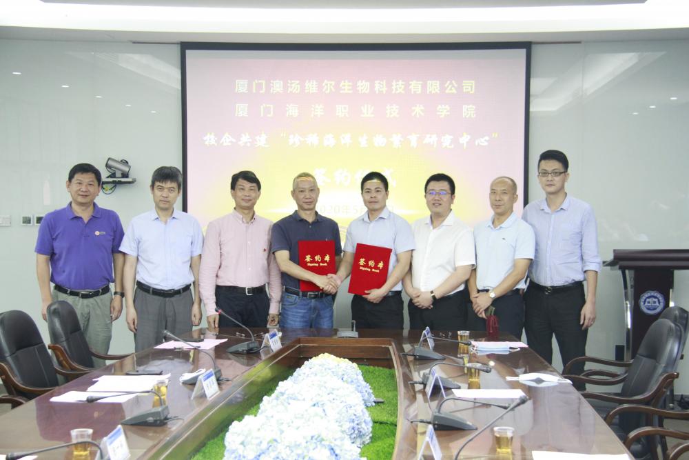 据悉,本次我院与厦门澳汤维尔生物科技有限公司校企合作重点合作项目为“珍稀海洋生物繁育研究中心”,规划建设面积约500平方米,3年内计划投入700万元,实现繁育珊瑚25种、育(保)种100种以上的目标。繁育中心的建成将进一步促进校企双方的深度融合、优势互补,不仅有利于学院海洋类特色专业建设、人才质量培养的提升,有利于企业提升效益及行业影响力,更有利于海洋生物技术研发与成果转化,支持海洋产业和海洋经济的发展,为福建的海洋强省战略贡献力量,为百年海院献礼。