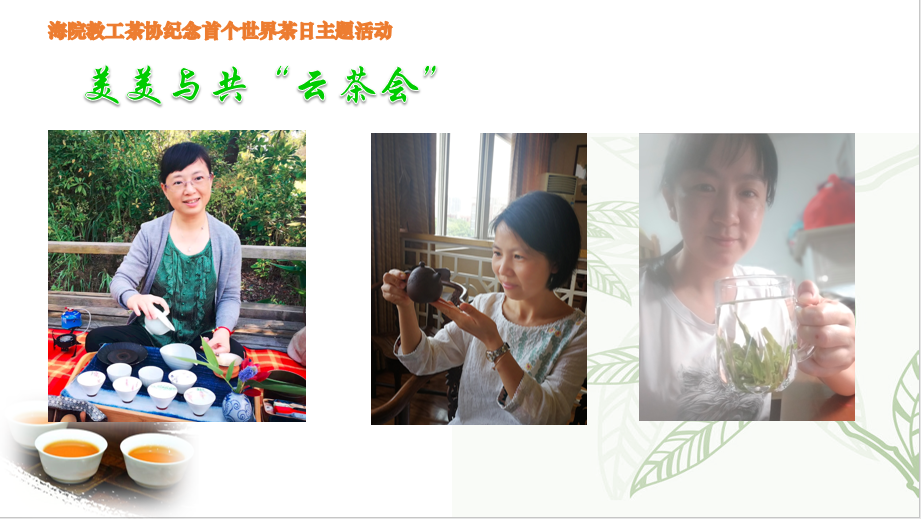 5月21日是首个世界茶日,我院教工茶文化协会的教师们从四面八方“云聚一堂”,以“美美与共云茶会”的活动方式,共同纪念该节日。