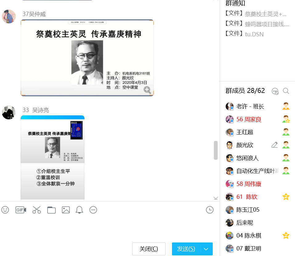 机电系教师利用线上教学课前时间带领各授课班级举行“祭奠校主英灵,传承嘉庚精神”云纪念仪式。仪式上,机电系教师回顾陈嘉庚的生平事迹,带领学生感受陈嘉庚一生赤诚爱国、振兴中华,毕生致力于发展教育事业的高尚情怀。最后,大家一起为校主陈嘉庚默哀一分钟。