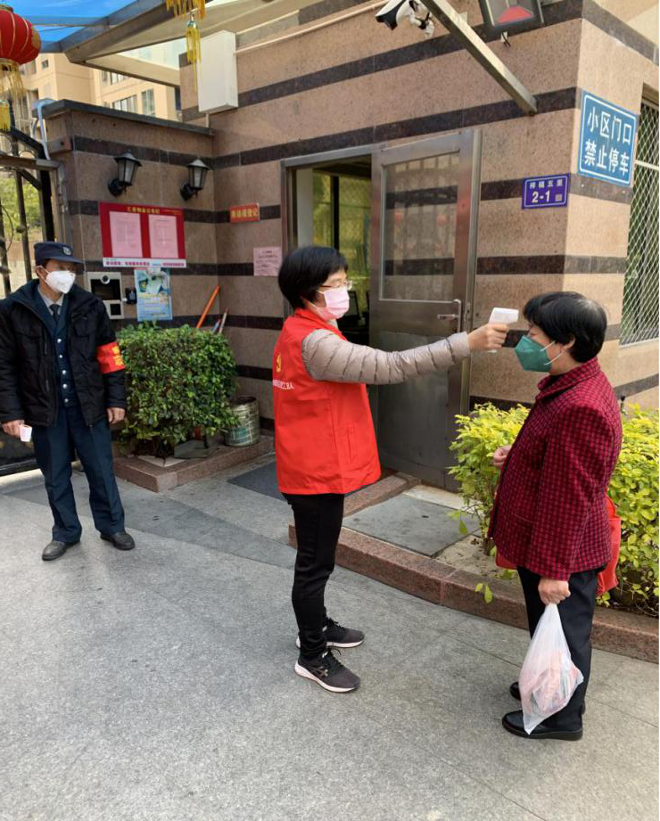 数学军事党支部胡明洁老师在疫情时刻勇当先锋,在美湖社区担任志愿者,在临时测温点对进出人员进行体温检测。